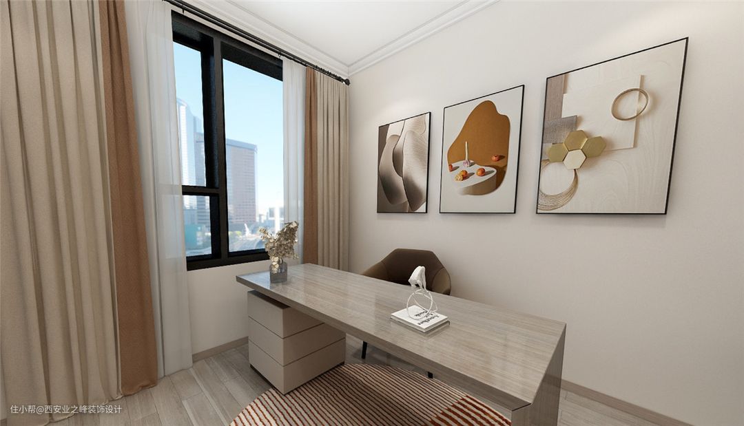 书房大型柜体满足书籍的分类收纳的需求,搭配简单现代的书桌,真题空间安静且有品质。