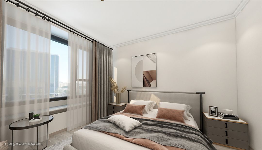 主卧室床头隐形灯带与夜晚静谧的环境营造出舒适感,加上黑色边框挂画使整个卧室不乏时尚感。