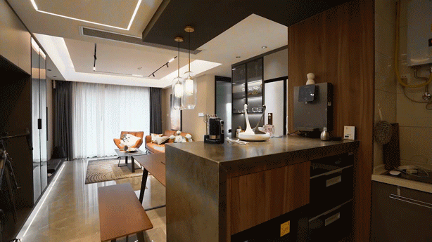 在客厅和餐厅之间安装吧台隔断,增加了收纳空间,还可以把吧台作为简易餐桌,偶尔一边吃饭一边看电视。