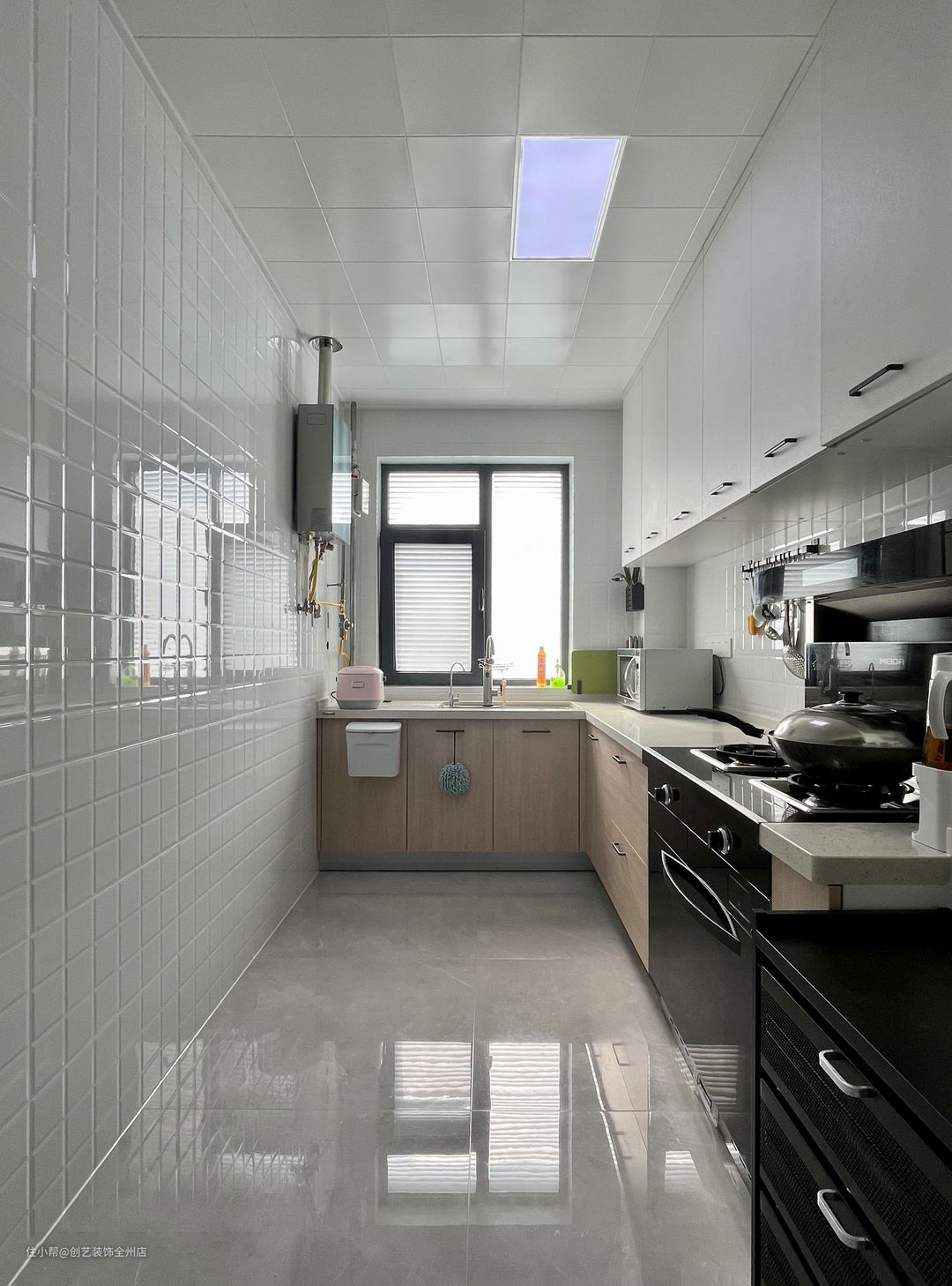 厨房内的地面采用了瓷砖铺设,瓷砖的材质更方便对厨房油污垃圾的打扫与清理,L型的橱柜充分利用了空间,上方悬浮的橱柜不仅节省了空间,也方便收纳厨房所需要的厨具杂物。整体白色的色调,也使得厨房显得非常的洁净卫生。