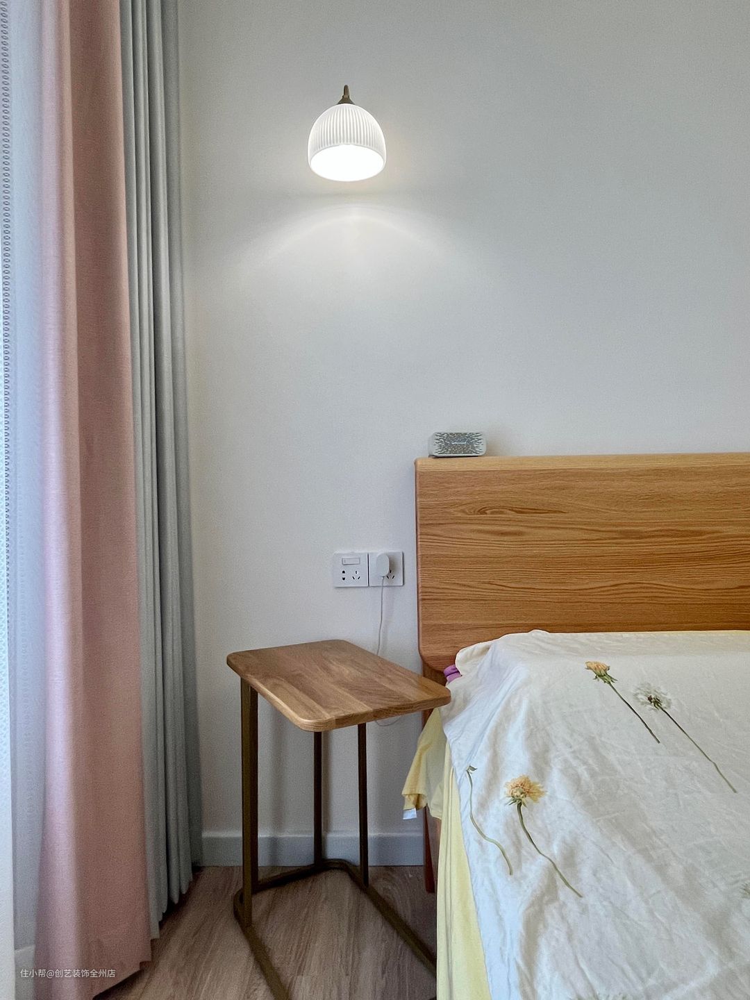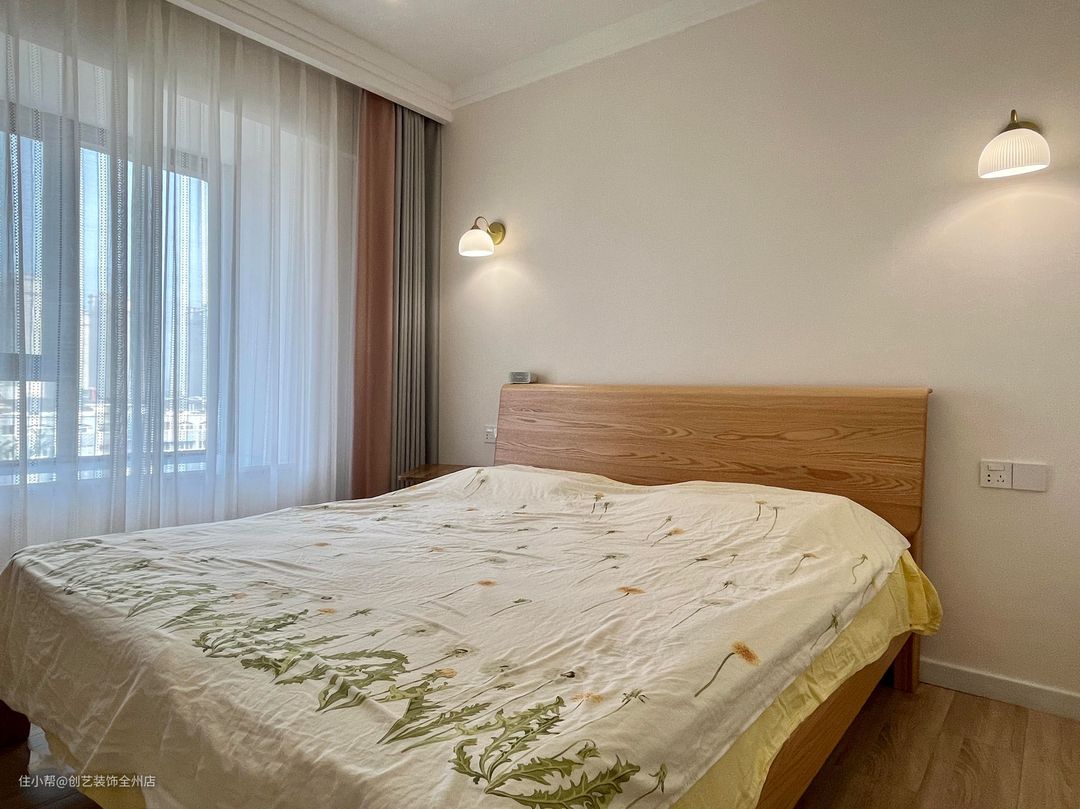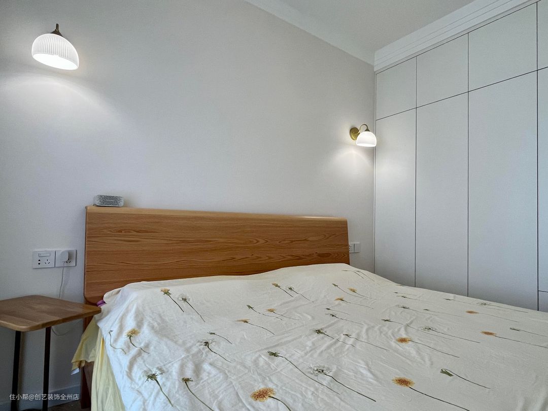 主卧的空间虽然不算大,但是日式风简洁柔软的设计使得主卧在视觉上给人开阔的观感。两个对称的床头壁挂吊灯的设计风格很好的融入的这个空间内,三色的可调节的灯光也满足了不同使用场景。