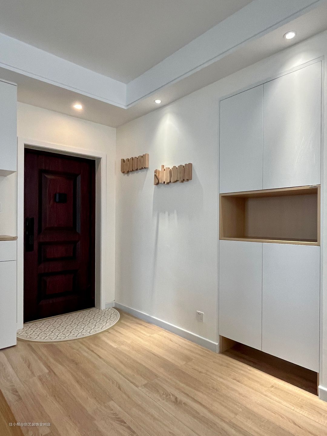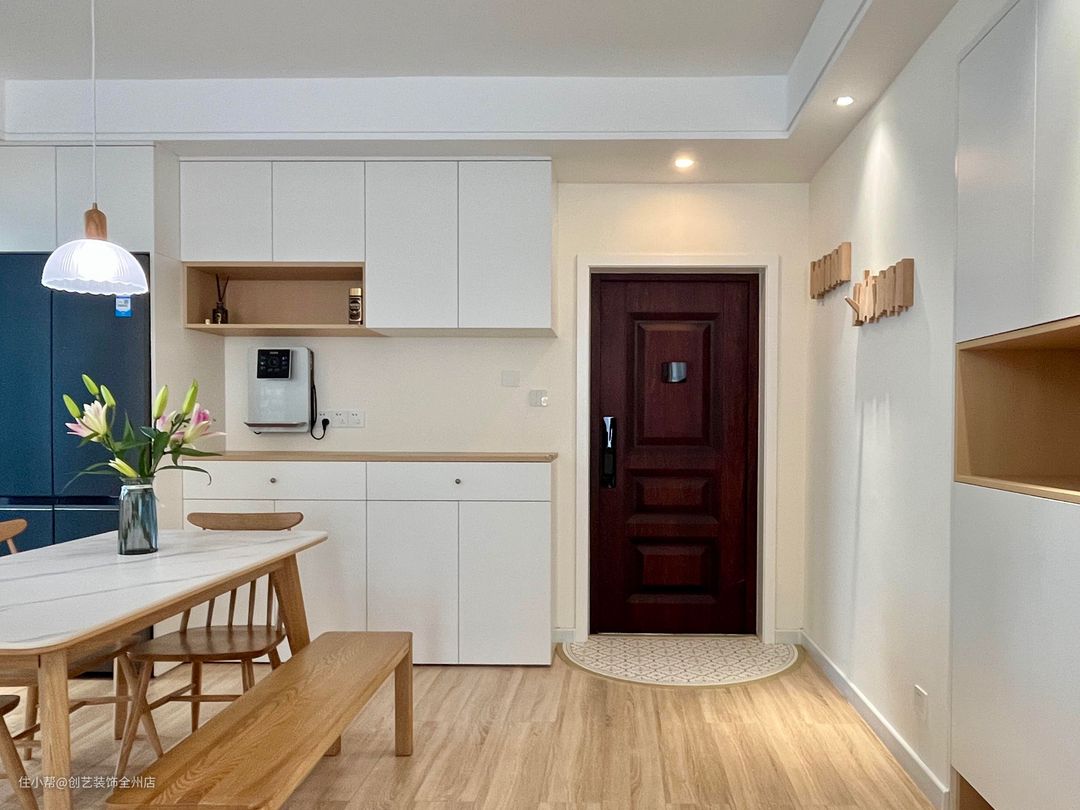 入户玄关的部分就有许多走心的细节小设计,右边的墙壁上做了两个日式风的可折叠挂钩,可以挂一些包包和衣物,旁边的柜子下方做了一个悬浮镂空的设计,预留下的空间可以放置拖鞋,让空间布局更加的整洁。
