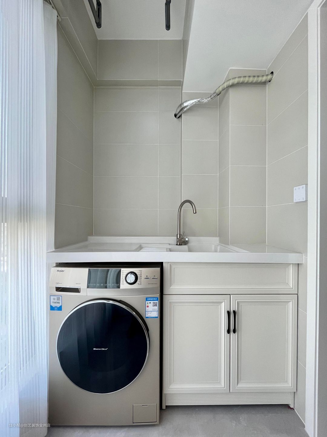 阳台的空间被充分利用了起来,内嵌式的设计,使得洗衣机在观感上并不突兀,瓷砖的铺设也不用担心水渍会伤害到墙面地板。洗衣机放置在阳台也方便业主清洗和晾晒衣物能够在同一个空间内完成。