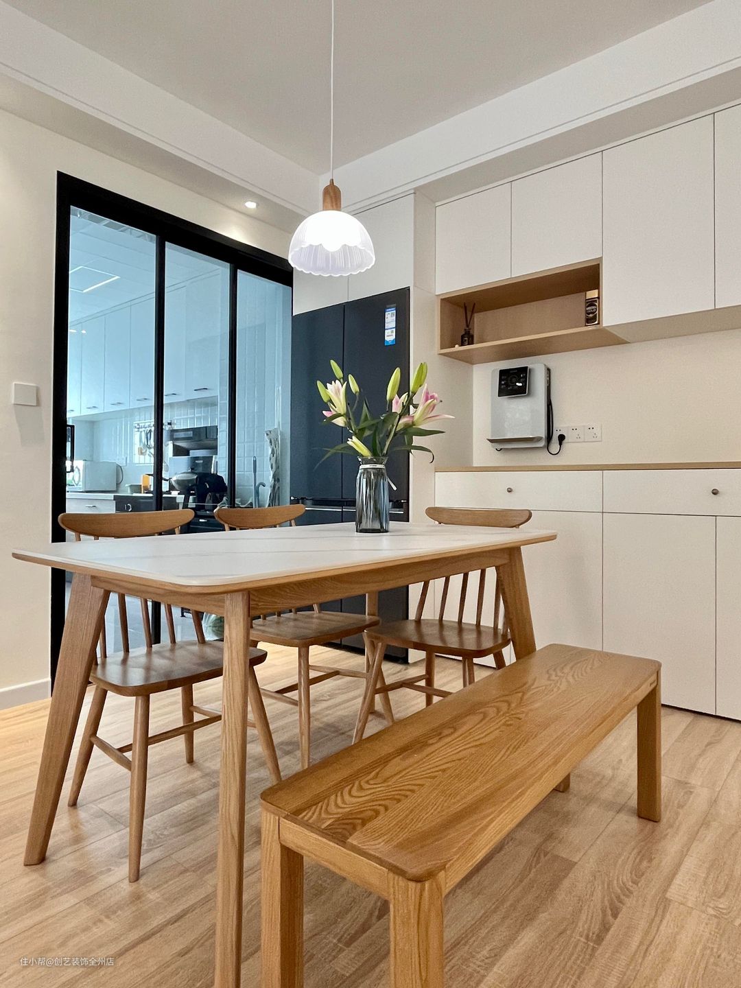 冰箱做了内嵌式设计,这样不仅节省了空间,也保留了视觉上的一体感。半圆式透明吊灯,作为点缀,使得整体看起来更加的优雅。
