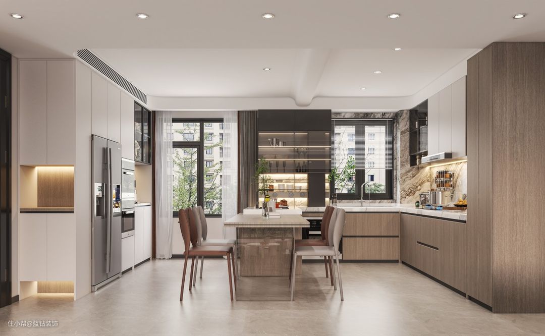 餐厅的设计也很简约,与开放式厨房相连,开放式厨房很有新意,可以方便美食家们互相帮忙,原木色的橱柜和原木色的餐桌餐椅,在整个空间里,色调统一又很温馨,就餐环境也会让人感到很温暖。