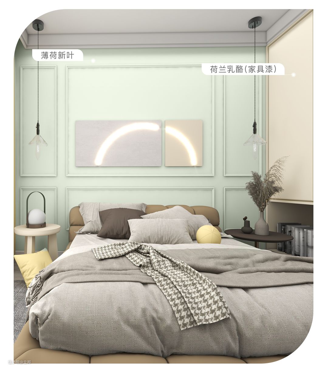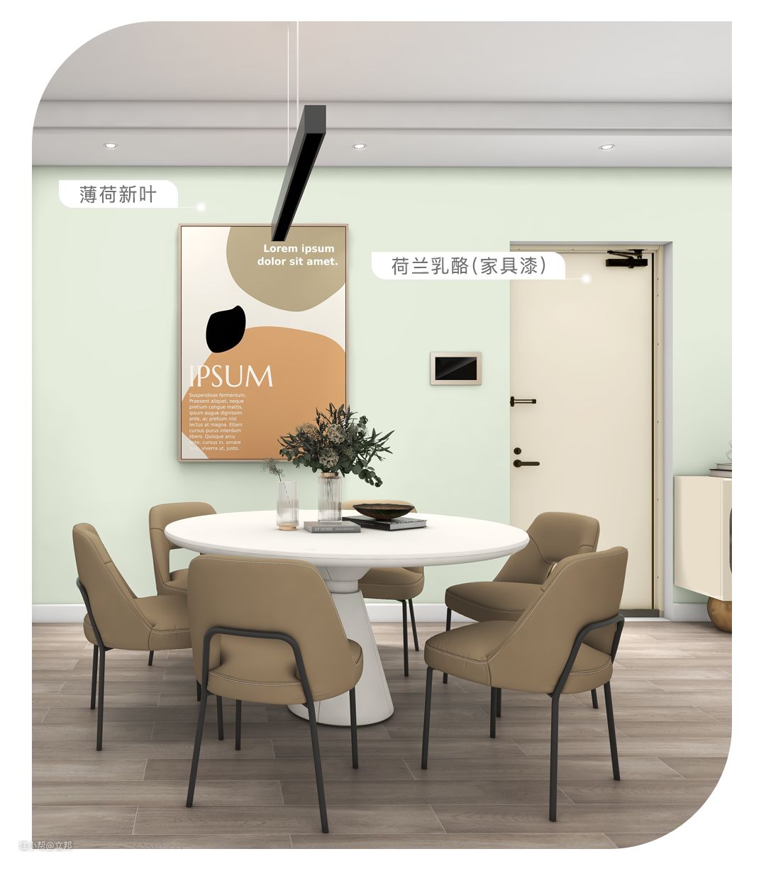 谁说奶油系不能带点“彩”?细腻的「薄荷新叶」全屋刷涂,恰似给房间尝了一口冰凉清爽的薄荷奶绿 ,让人神清气爽;同为奶油色系的家具漆「荷兰乳酪」运用于家居,让生活散发出甜美温柔的气息。挑选软装时,可以使用花生巧克力的金棕色系,给你带来甜点般的美妙体验。