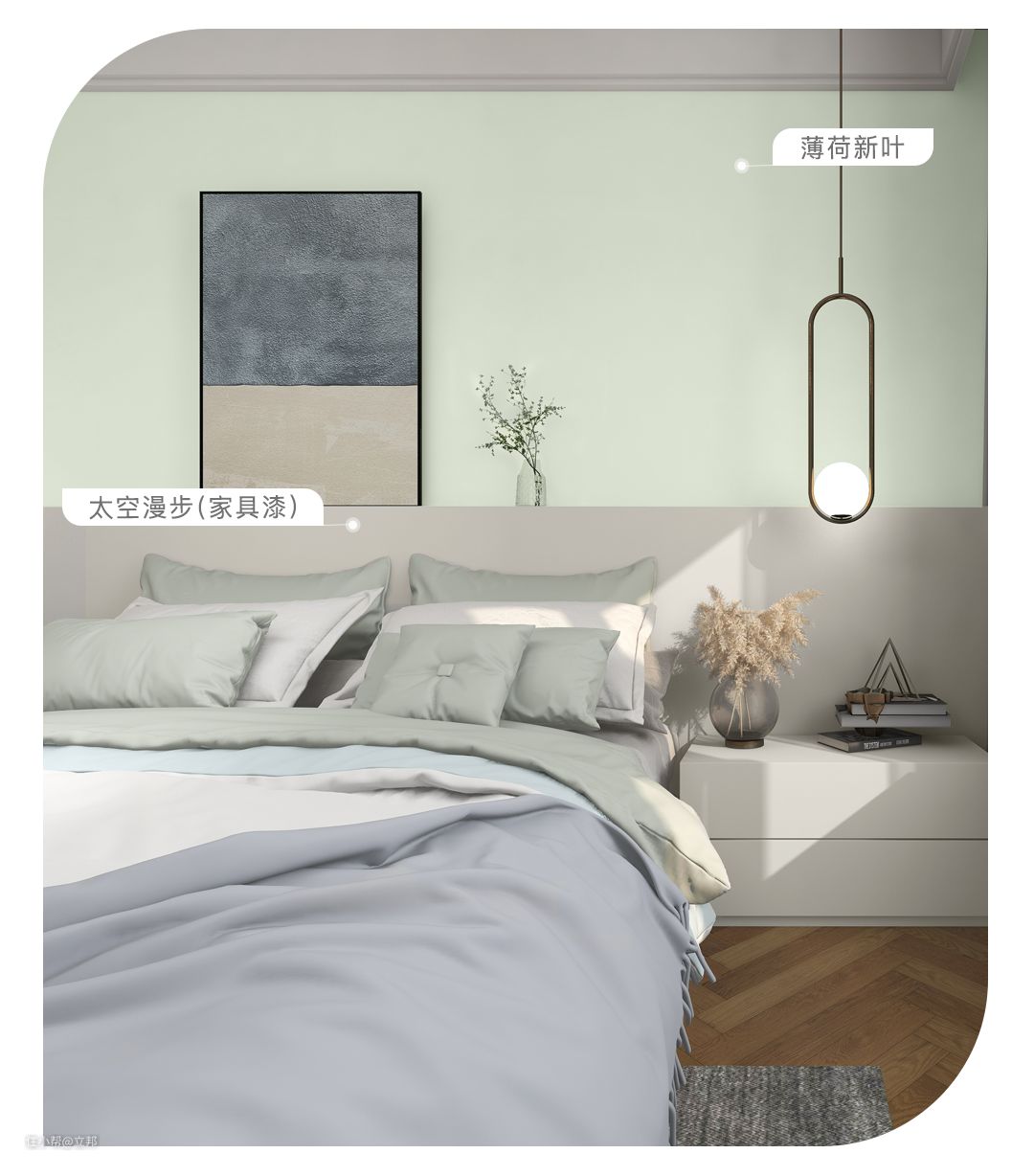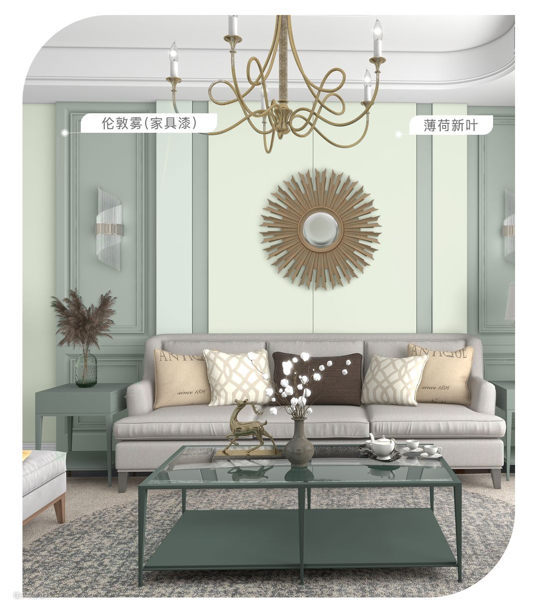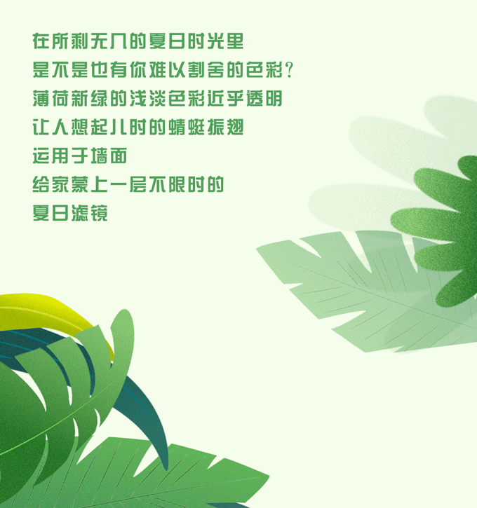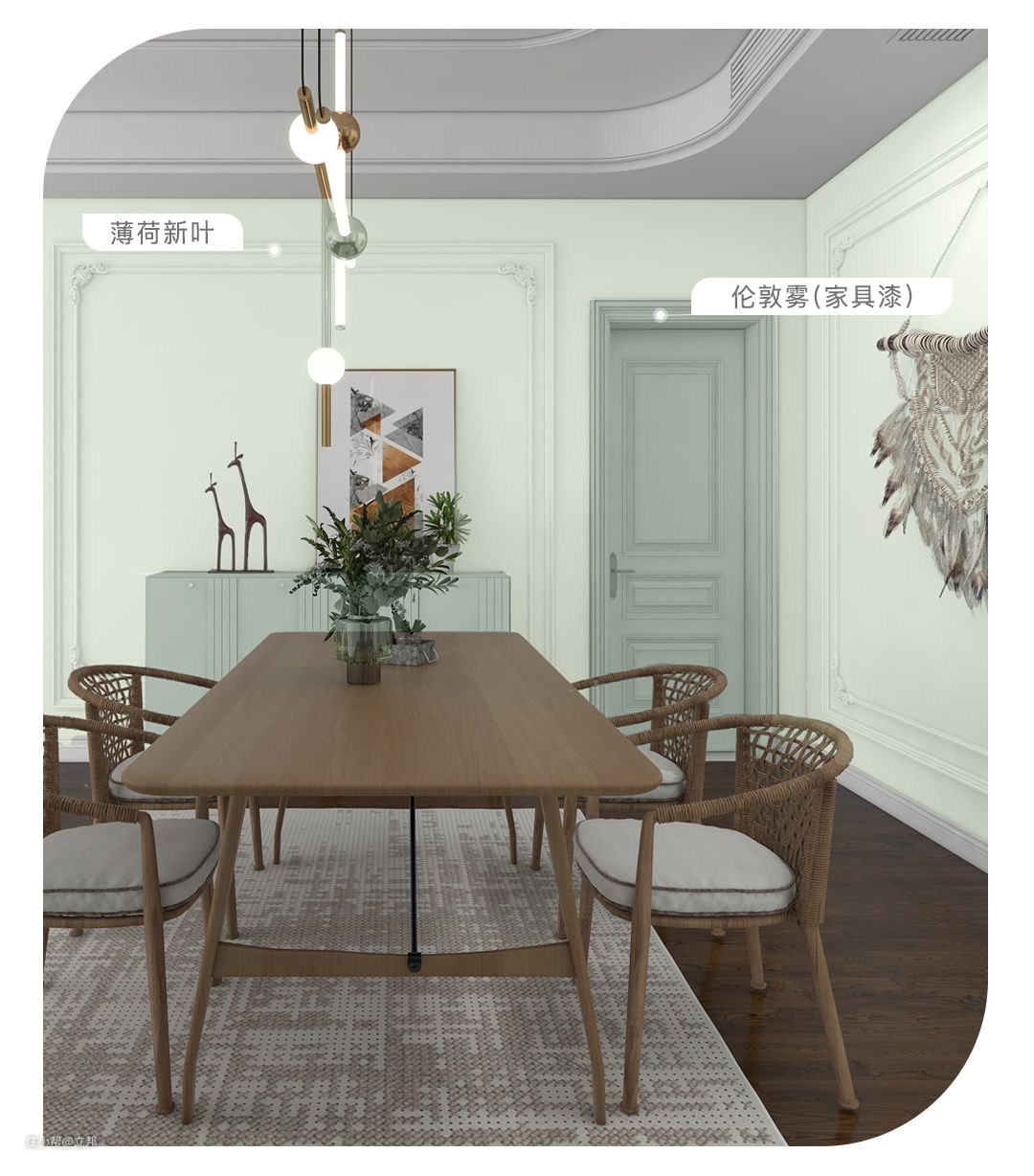 南洋风的装修会采用大面积的绿色,展现出热带地区与自然和谐共生的设计理念。「薄荷新叶」的色彩轻盈不浓烈,却能给空间奠定淡淡的自然基调;「伦敦雾」的薄雾绿自带复古感,运用在家具上,为生活空间带来富有艺术感的异国风情,搭配木制或藤编家居,在富有层次感的同色系软装中打造岁月静好的生活氛围。