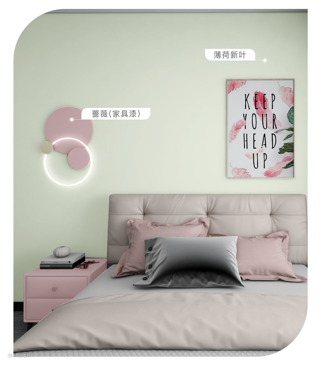 暗粉色家具点缀于清新的绿色调房屋中,让室内空间变成具有自然气息的“生活花园”。沉稳的「蔷薇」刷涂于木制家居,显得浪漫而富有情调,为充满跳跃感的「薄荷新叶」注入平缓而安逸的内核,搭配低饱和度的粉绿撞色家居,带来舒缓和谐的轻法式风格。