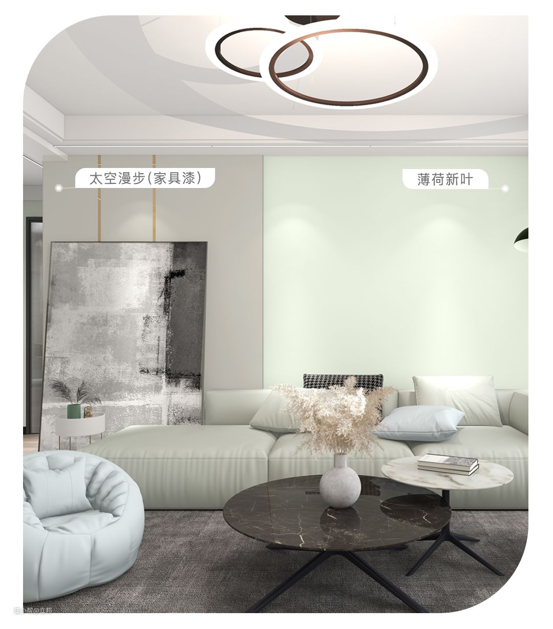 清淡明亮的色彩搭配有质感的灰色,看似漫不经心,但有时会产生意想不到的效果。「薄荷新叶」透着糖果感的浅绿搭配运用「太空漫步」的浅岩石色家具,可以创造出清新而带有冷静气质的现代感家居场景。结合冷色调的装饰元素,轻松打造不被定义的ins风家居。