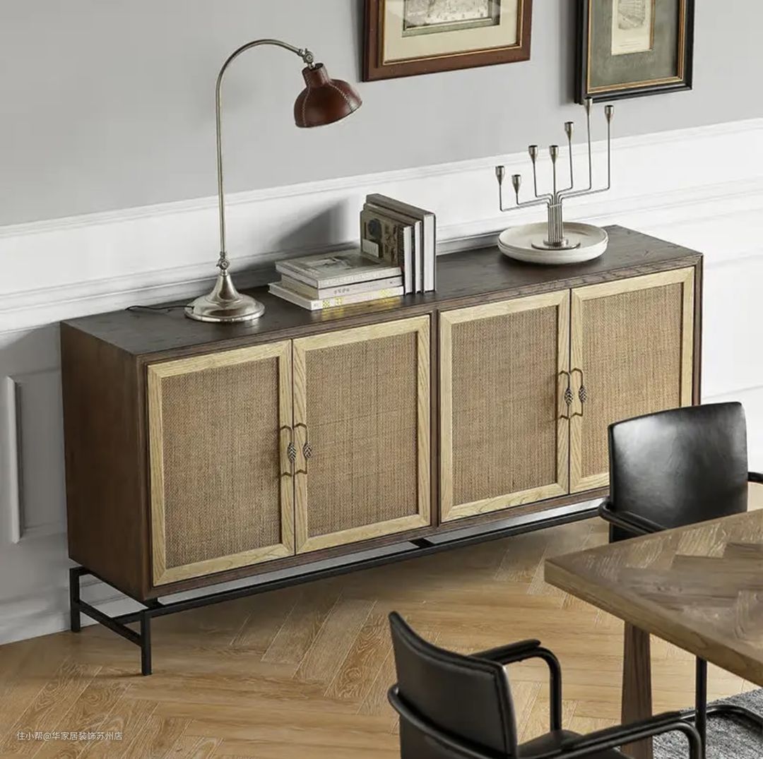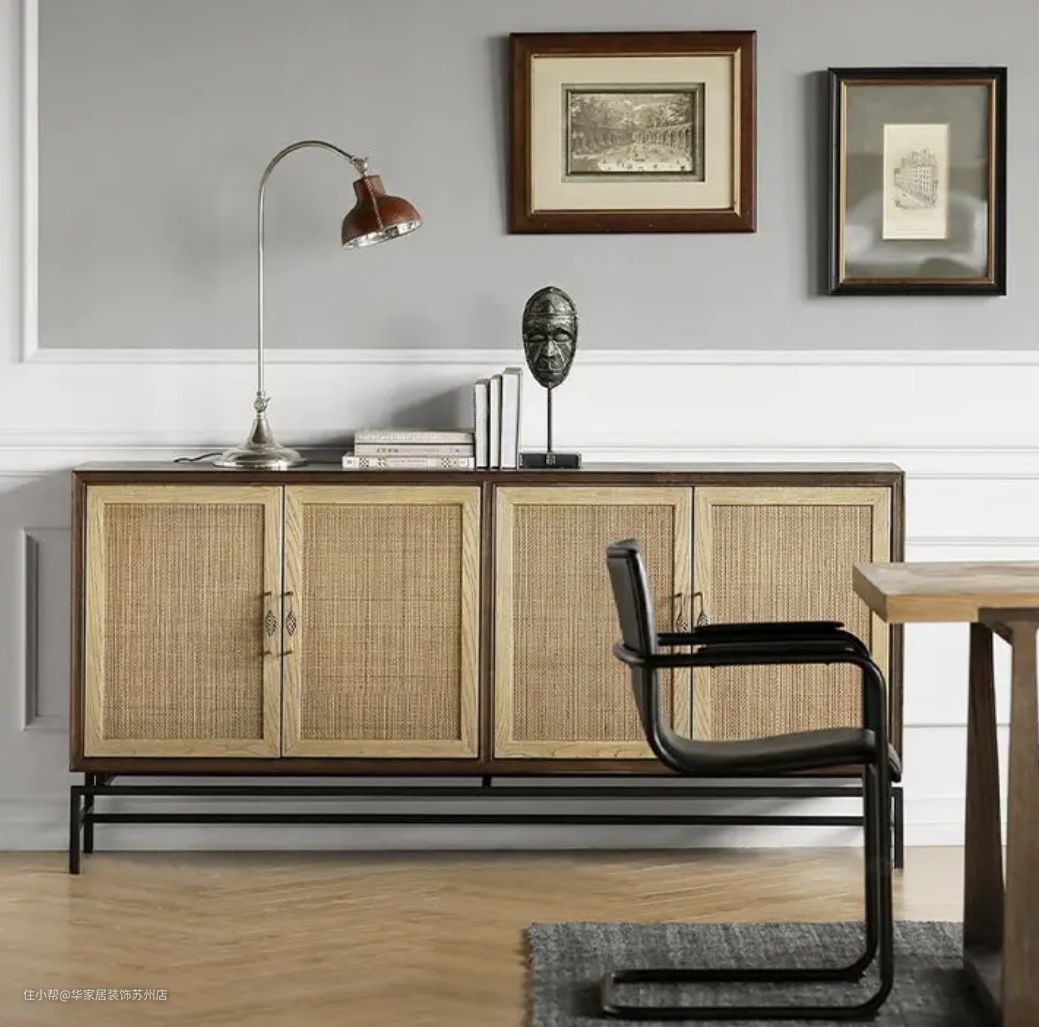 餐边柜选择实木+藤编的设计,更加复古美感;选择高挑脚设计,可以容纳扫地机器人的随意进入,易清洁;