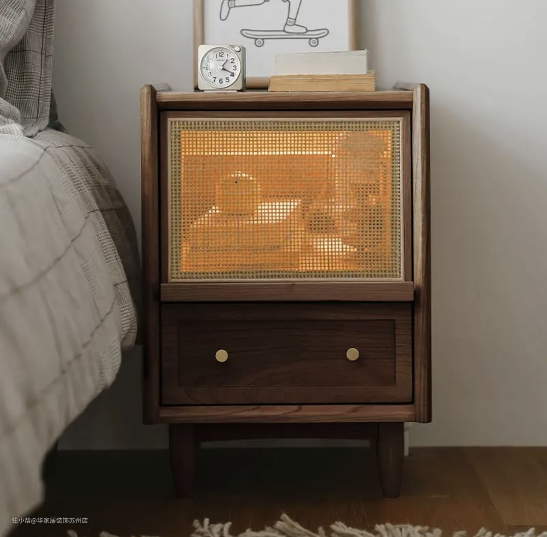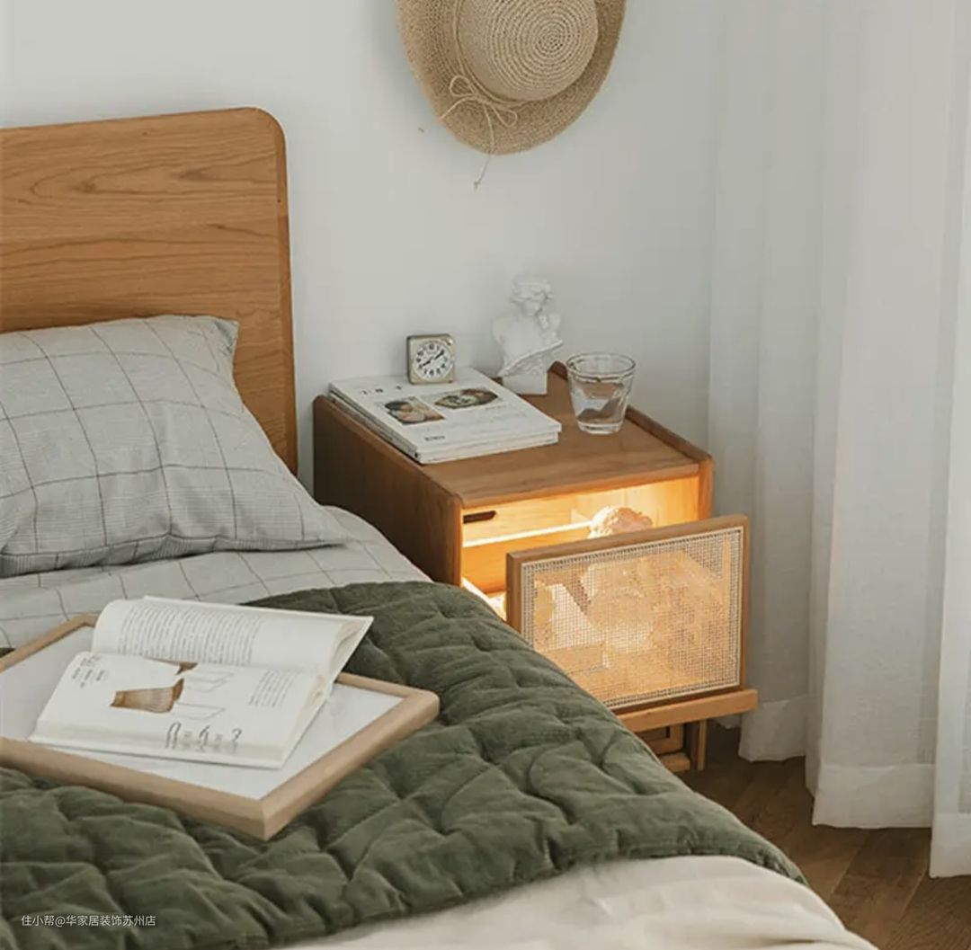 选择藤编床头柜,这款更加适合小居室,不会占用太多的空间,超级百搭,不仅保持了装饰性,而且还能保证收纳性;
