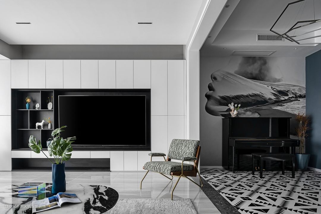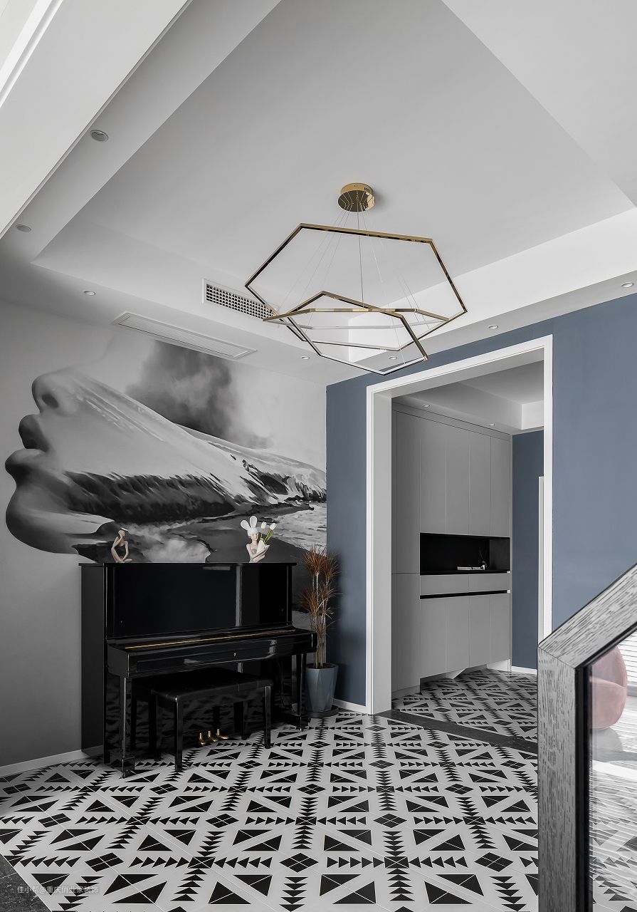 如果有练习乐器的需求,家里放置乐器也是一门“学问”。本案琴房位于入户与客厅之间区域,整体是开放式布局。墙上是随性的黑白蒙太奇人像画,地上是现代风的黑白花砖,黑色钢琴伫立其中,设计师用两个对立面的颜色搭配出简约又丰盈的魅力空间。