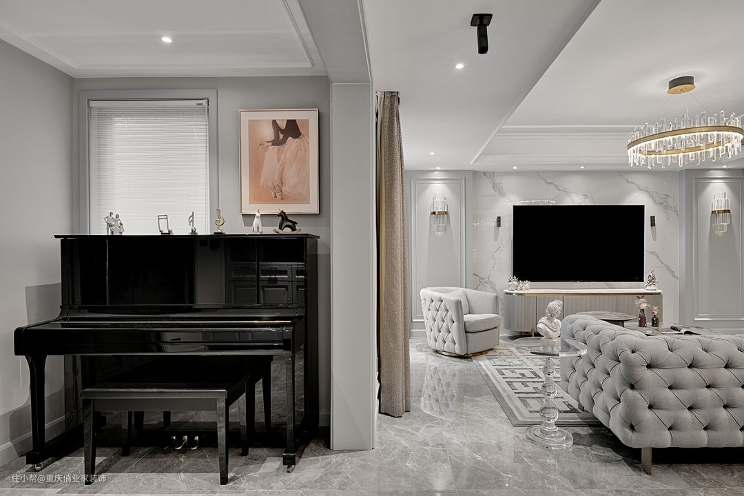 或者将给钢琴放在恰到好处的角落位置,钢琴黑色的肌理感搭配杏粉色舞蹈挂画,再辅以各类摆件将优雅的浪漫贯彻到底。不需要过多的技巧去渲染空间的独立,而是让它融入整个大环境。