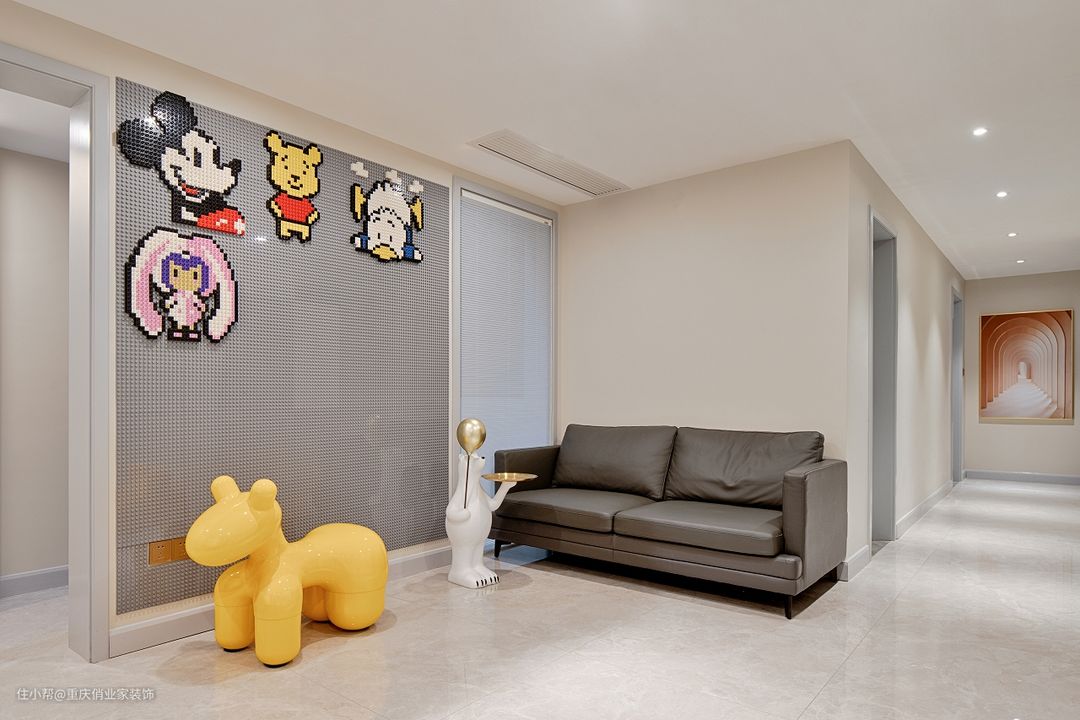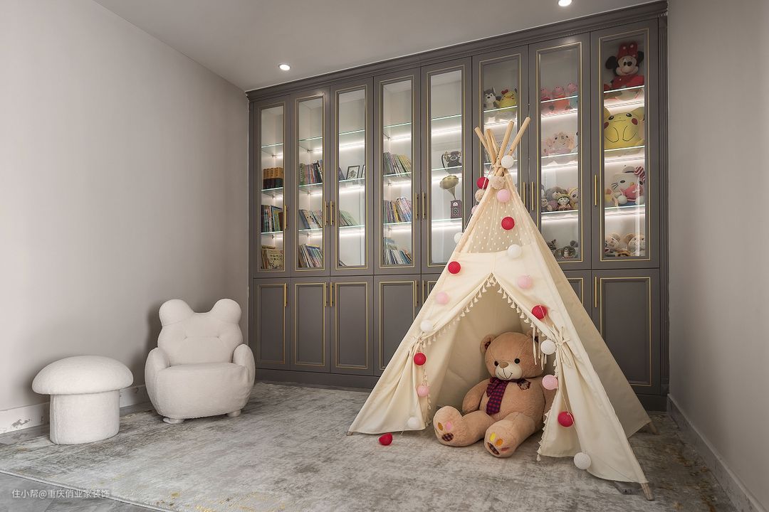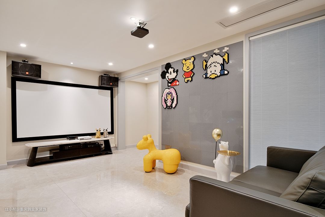 留出通透的空间给孩子们跑跳打闹,肆意生长,不用做太多处理。铺到顶的积木墙让少年们自由DIY,提高想象力和动手能力;玻璃白板为家庭教育提供辅助;高清投影见证一家人的观影时光。
