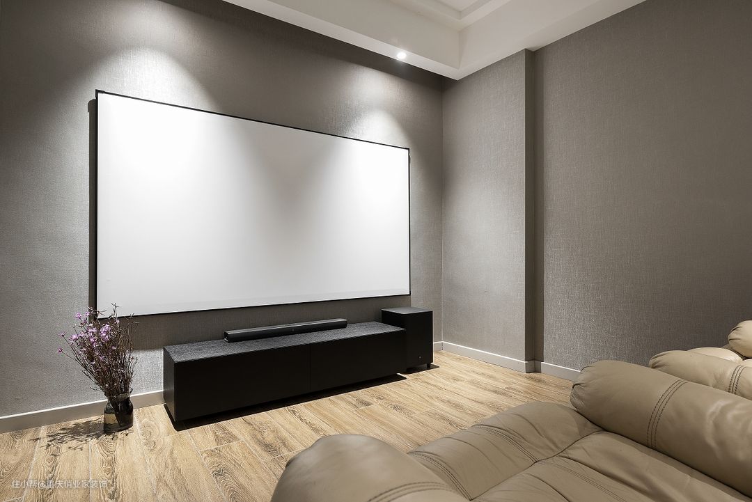 这是位于业主家负一楼的观影室。设计师采用无纺墙布贴满整个空间以节省成本(因为是端户天然隔音)。无主灯设计使空间明暗交接,营造浪漫温馨的氛围感;搭配两个单人位的柔软沙发可以让业主夫妻充分沉浸在影视世界中。