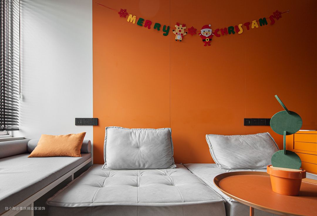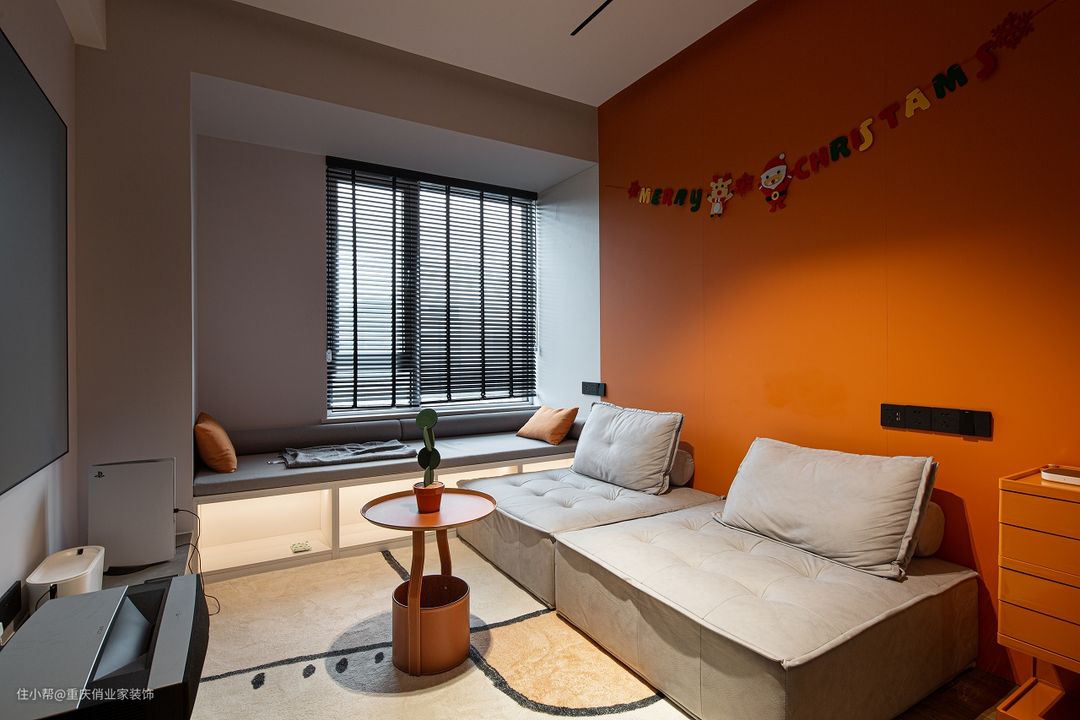 灰白色系为基底融入热烈的橘黄,卡通贴纸点缀显得格外温馨;临窗用置物柜做软塌,靠窗摆放双人位的榻榻米沙发,还有满铺的短绒地毯,都为他提供了及其舒适的观影环境。