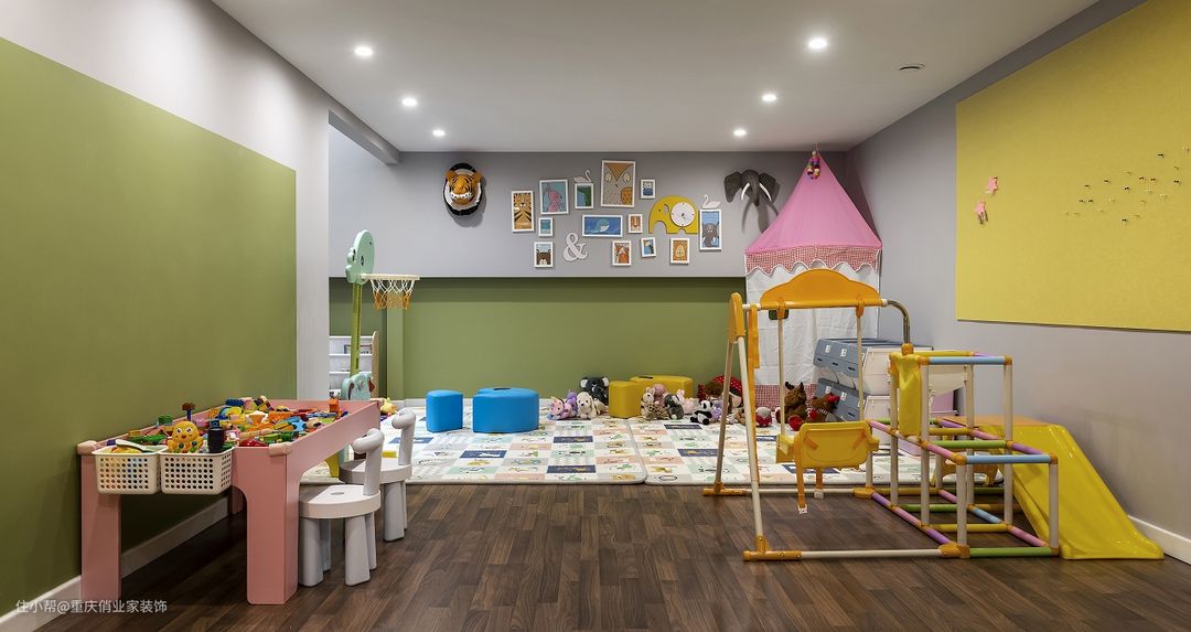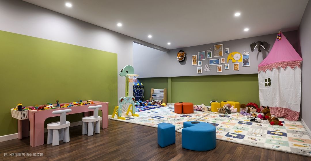 本案的业主将层高5.1M的地下车库现浇出一层,打造了15㎡的“游戏城堡”。整个区域都选用了木地板,玩偶和篮球架等玩具都放在了柔软厚实的爬行垫上,就连攀爬架和积木桌子的尖角也选择用防撞道具包裹,十分细心。
