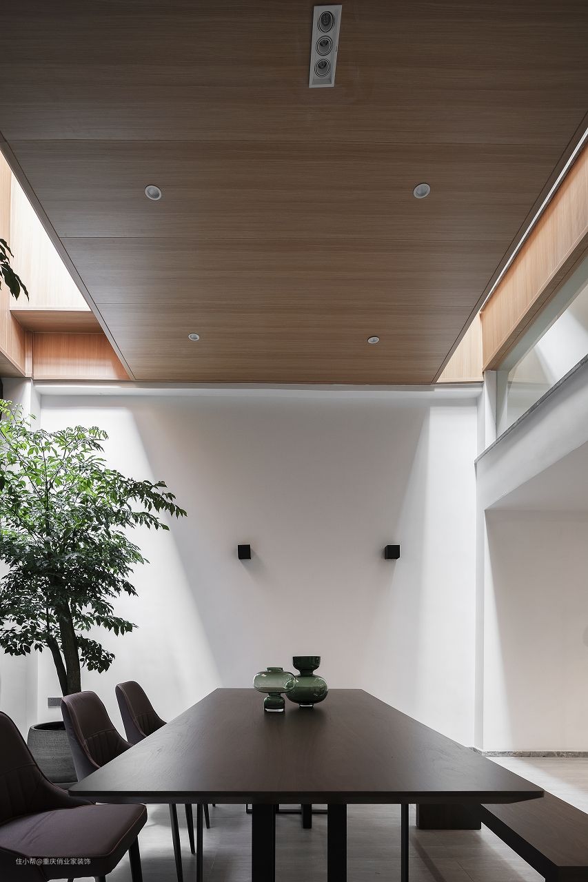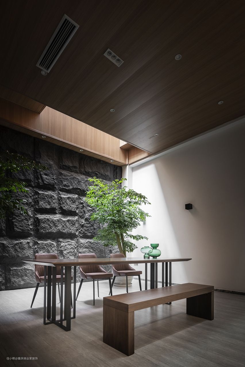 对于爱喝茶会友的朋友来说,在家里设计一个茶室是非常惬意的事情。而茶室的位置恰好非常考究主人的生活品味。这个案例里面设计师将茶室放到负二楼,利用采光井引入自然光线,完美改善了采光和通风问题。生态板吊顶防潮又美观,筒灯提供辅助光源;阳光沿石墙洒下,落到生机蓬勃的绿植上,极具自然气息;实木长桌组合靠椅和长凳,让整个空间极具中式的留白雅韵。