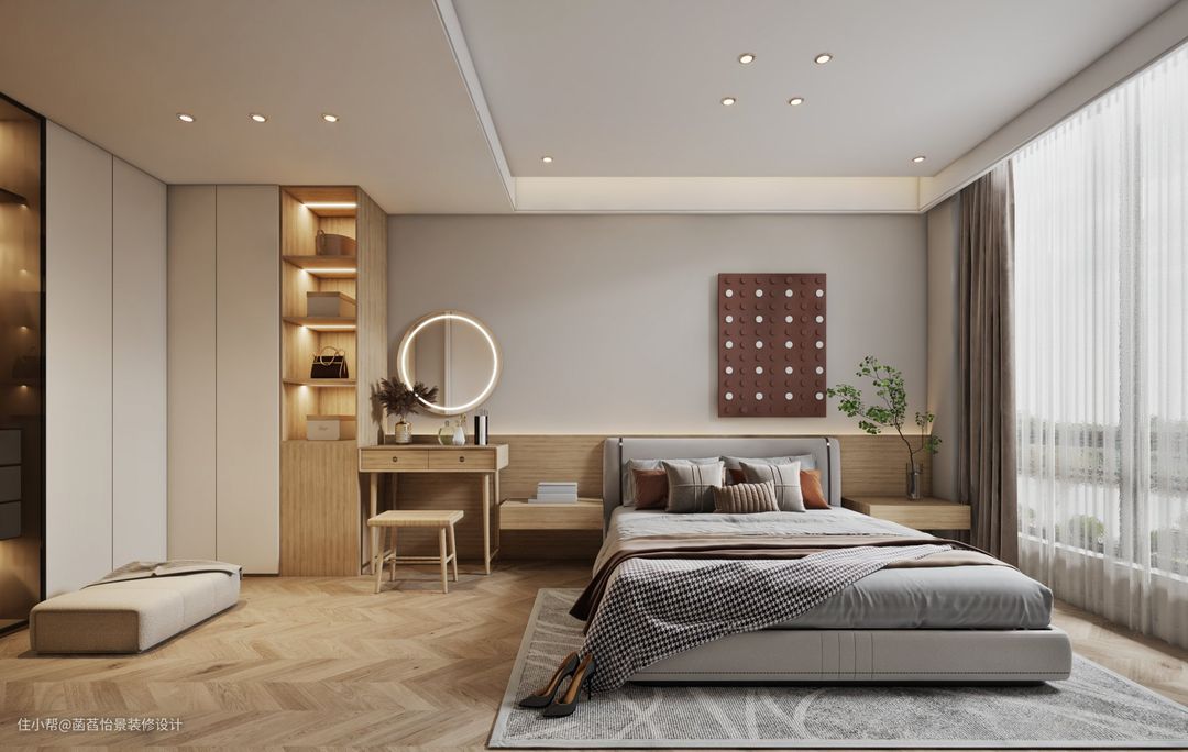 卧室的空间中,一张柔软舒适的双人床搭配着两侧的床头柜与一张定制的梳妆台,可以很好的满足生活的基本使用需求。
