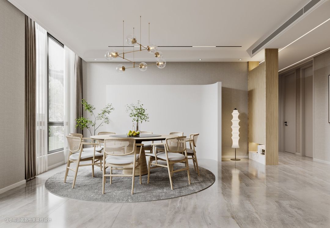餐厅在一个独立的空间中,圆形的餐桌搭配着顶部的吊灯,带来明亮精致的用餐氛围。