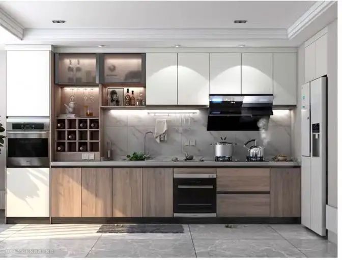 目前家居市场上柜门主要分为几种材质。第一种首先便宜一些的橱柜门板是晶刚门。晶钢门已有很多年了,主要优势就是比较便宜,防水性能不错。以钢化玻璃为主,然后搭配铝合金的边框。内部材质基材都是以钢化玻璃。正常在市场上大概的价格实在130-150每平方。缺点就是外观没有档次。因为橱柜最后展示在面前的最大面积就是柜门。所以柜门的颜值还是非常重要的。