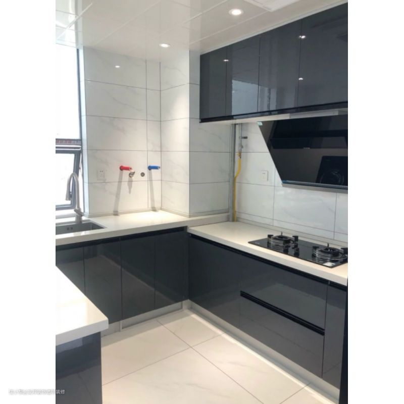 第五种就是目前比较多最火的PET柜门,主要分为肤感门,亮光门。厨房用的比较多的以亮光门为主。因为后期好打理。肤感门摸起来手感比较好。亮光门基材是欧松板或者是密度板。市场价格大概在230左右每平方。如果换成肤感门价格要加40左右每平方。如果说使用师门多层或实木为基材为主的话就会更贵一些。PET柜门推荐选择欧松板,后期平整度性价比各方面都比较好。