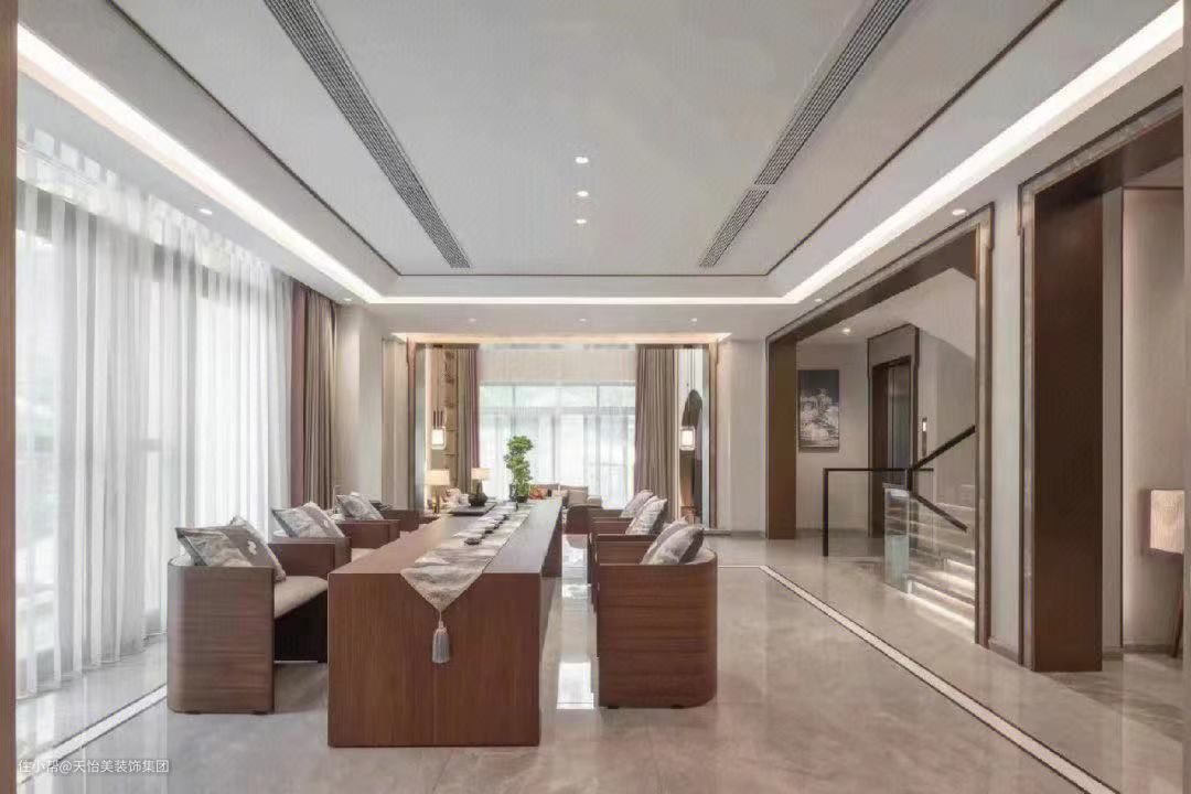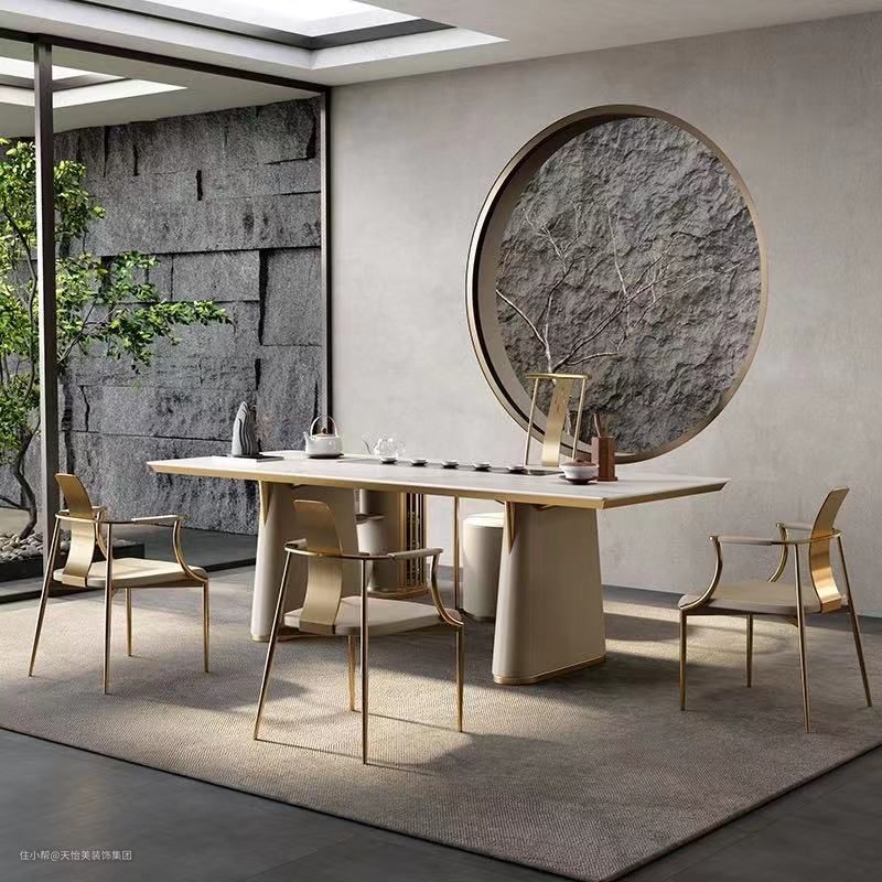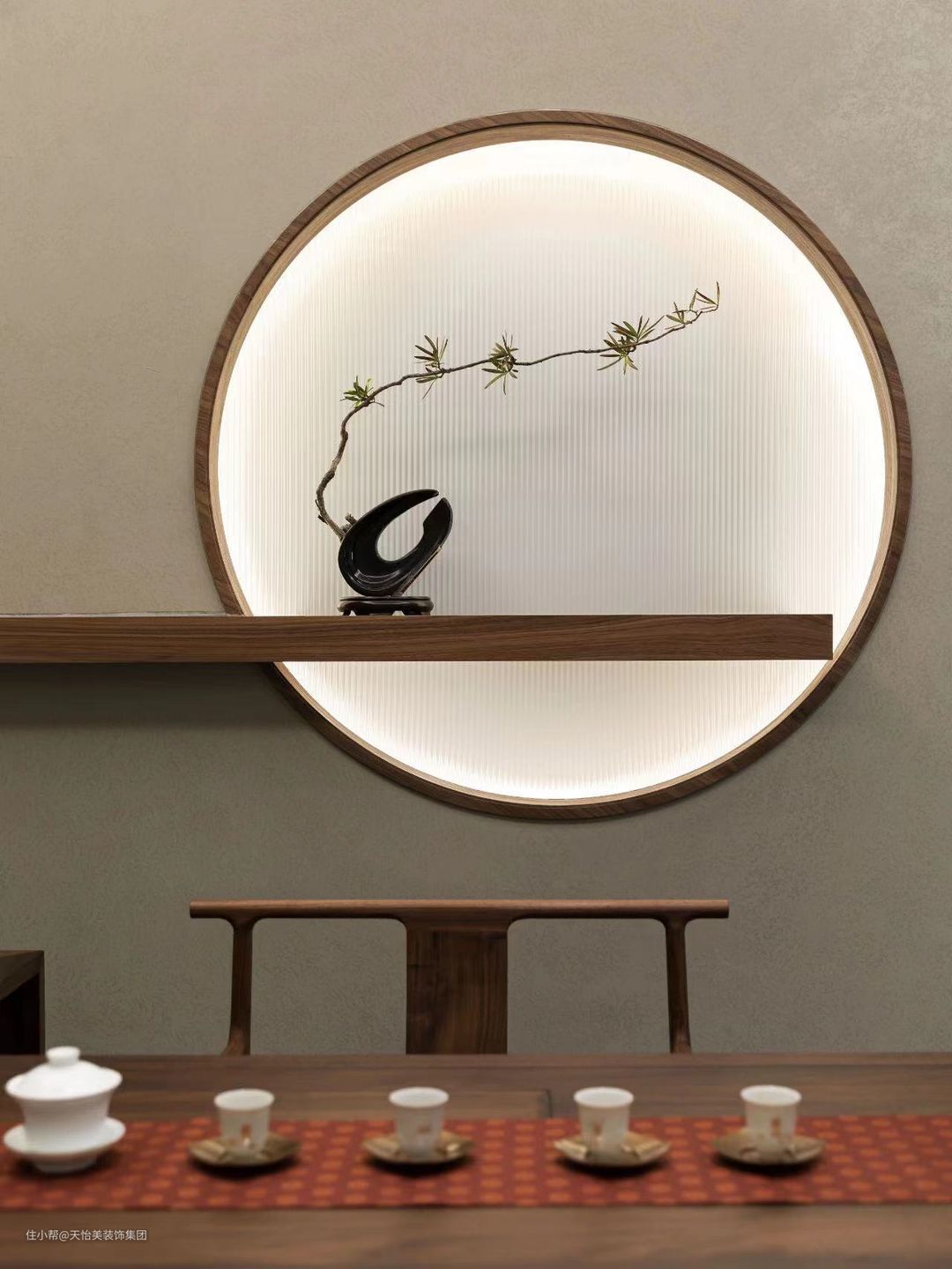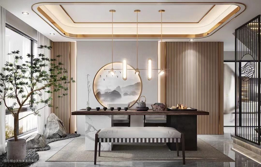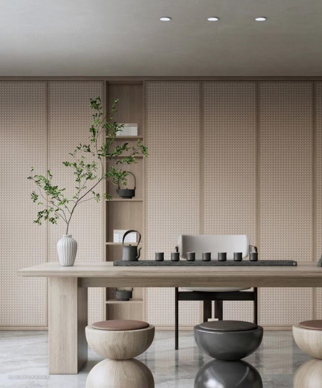 茶台侧边做留白设计,只一株绿植,透着清新自然;或是一尊石像,透着现代与时尚。闲坐木椅,与友畅谈,共酿一壶茶香,无主灯设计下,茶汤浅绿鲜亮,细品一口,让人回味无穷。