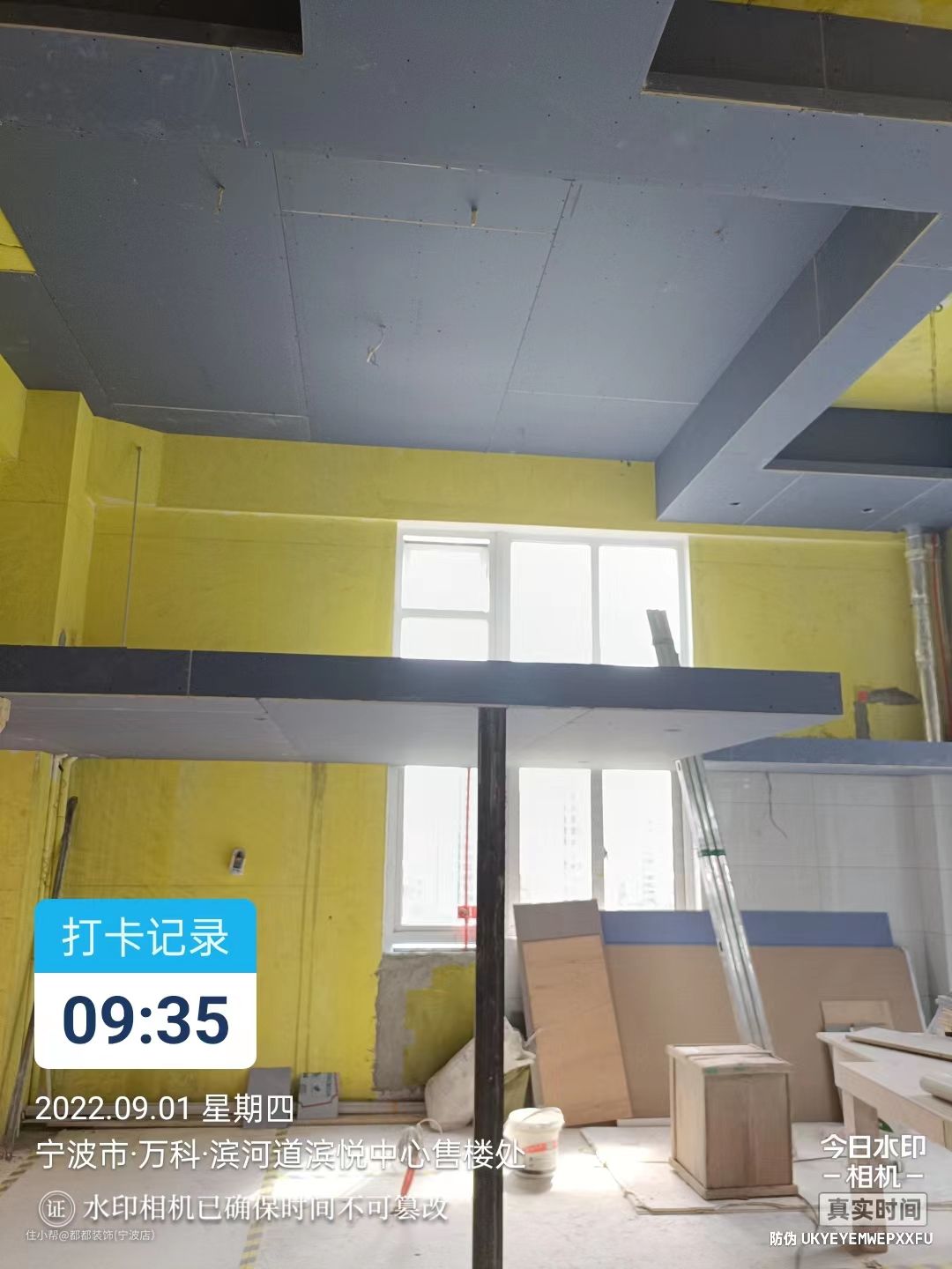 石膏板与轻钢骨架的固定可采用自攻螺钉固定法,在已装好并经验收轻钢骨架下面,安装9.5mm厚反。安装石膏板用自攻螺丝固定,固定间距板边为200mm,板中为300mm;自攻螺丝固定后点刷防锈漆。