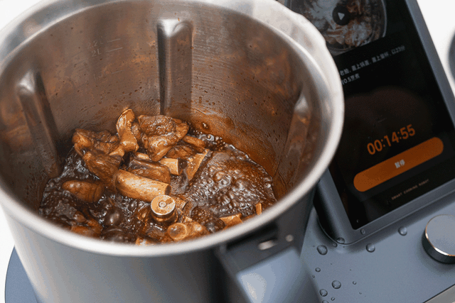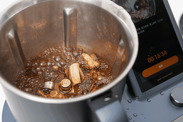 在红烧这种菜谱中,机内的搅拌桨叶会反向低速搅动,以均匀烹饪食材。