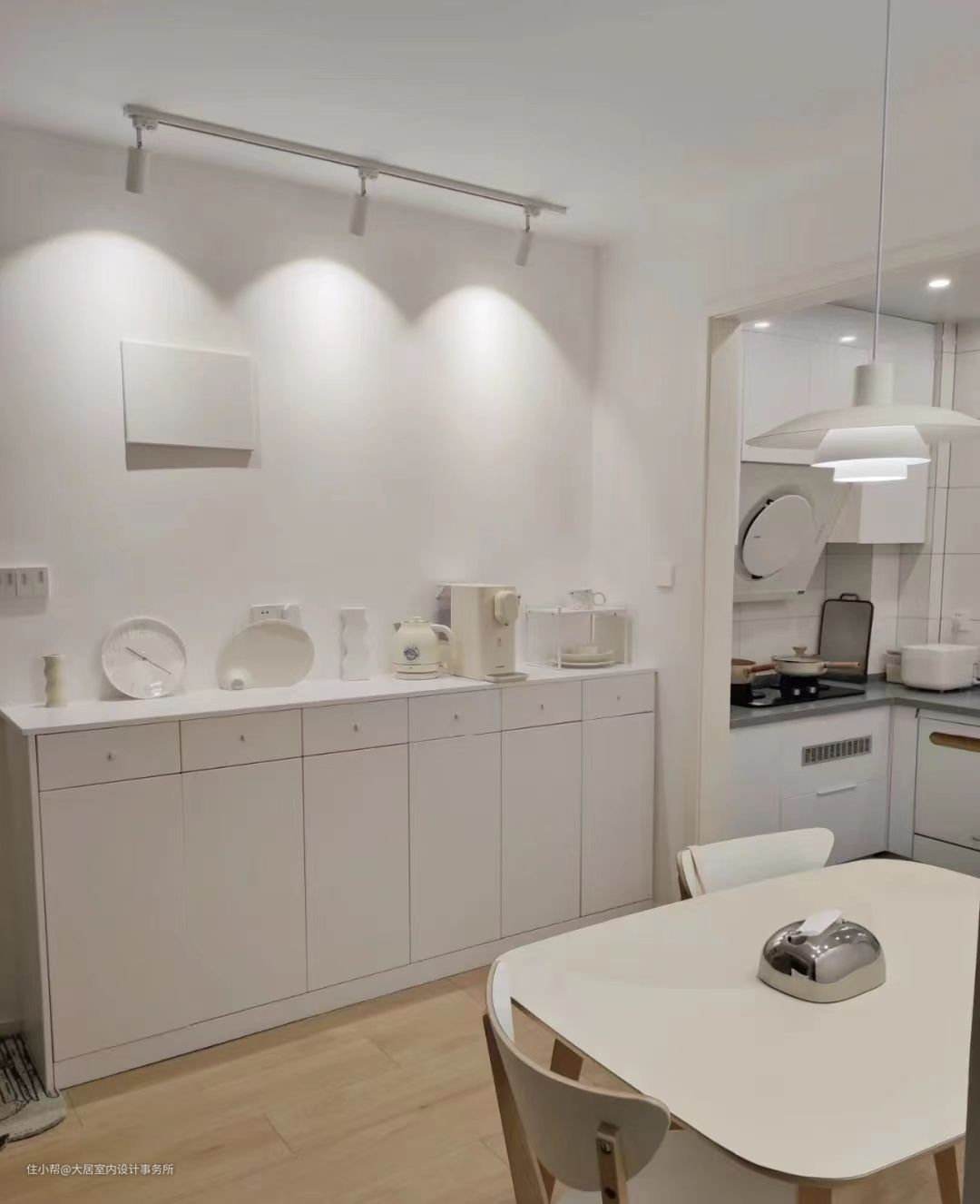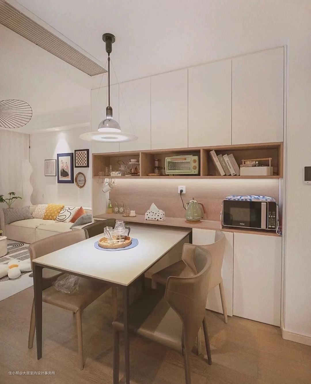 如果收纳空间不足,可以利用墙面的垂直空间,采用矮柜加吊柜,或矮柜加隔板的定制设计,增加储物功能的同时,也不占用平行空间,让单调的餐厅墙面变得有趣生动,格调满满。