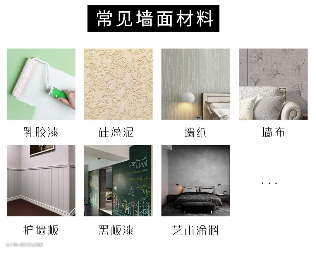 墙面常见的材料有乳胶漆、硅藻泥、墙布、墙纸以及近来较火的艺术涂料等。