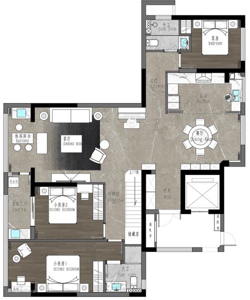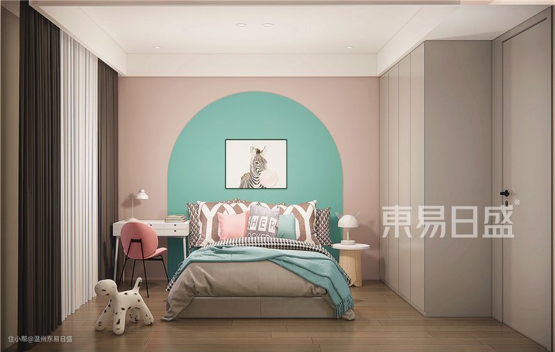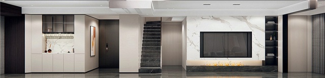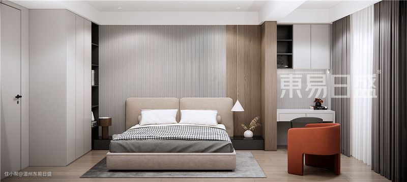 本案的设计以现代为主题,空间整体以黑白灰三色相互搭配,从而达到视觉上的一种层次感。客餐厅大部分使用米白色墙板,背景拼接黑色大理石,小部分区域使用黑色墙板和深棕色木饰面做协调,地砖搭配深灰色,整个空间呈现一种沉稳的质感。迎合现代年轻的感觉在软装搭配上用橘色和橄榄绿做出一些跳色的感觉,结合灯带的使用让空间透气了些。主卧以暖色调为主,在软装饰品上也做了一些跳色的搭配,空间不会显得太单调。男孩房的背景使用白色格栅和木饰面的结合,床品的搭配也是比较迎合当代青年的审美。女孩房考虑到业主女儿的年龄还是保留童真的感觉,背景做了粉色和薄荷绿的撞色搭配让这个空间显得更活泼。