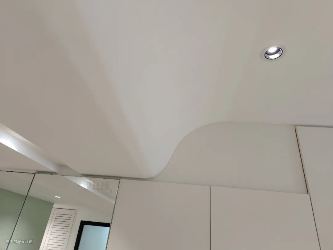 在层高较矮、中间还有横梁的户型,可以在横梁与天花之间做圆弧过渡造型的吊顶,从横梁到天花之间做一个弧度造型,让层高差不会过于明显,同时又能实现更加丝滑的空间。