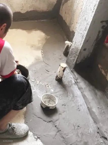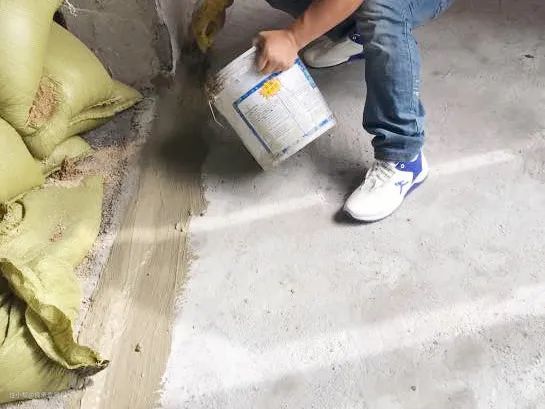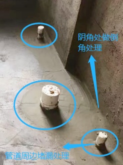 待找平层干透后,在管道口做密封处理;在管根、地漏、阴阳角、四周墙根、止水坎周围涂刷堵漏材料,涂刷直径为300mm,墙角处沿墙地面上下各涂刷150mm宽。