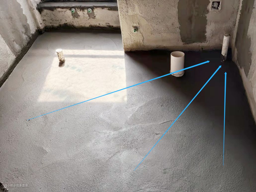 将基层有凹陷裂缝之处,用1:3水泥砂浆填补抹平。有地漏的区域,找平层需以地漏为中心,整体向地漏倾斜出坡度。
