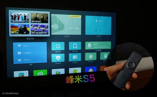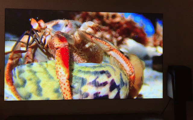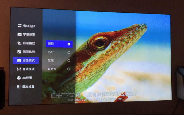 一是硬盘播放4K影片的区别。说实话,系统硬件的差异+接口上的差异放大了峰米S5激光投影仪与极米Z6X的差别。比如同样是连接SATA固态硬盘播放4K高清《小小世界》纪录片,峰米S5激光投影仪播放就比较流畅,音画同步效果好;但极米Z6X就会在快进或者跳播时偶尔出现卡顿、音画不同步的情况。下图是峰米S5播放的效果图。
