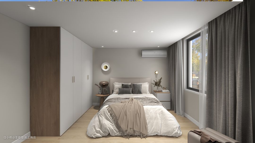 因为整体层高问题,主卧做了无主灯,以射灯和壁灯的形式打造灯光的层次感,色调以暖色为主,让整体空间整洁明亮,营造温馨的氛围。