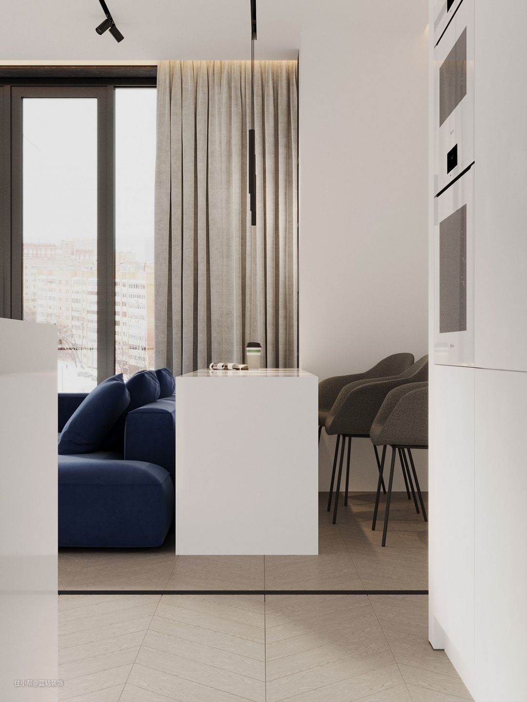 至于软装选择上,舒适的深蓝色沙发,搭配深灰色的高脚餐椅,以及浅灰色的麻布窗帘,让整个空间看起来都十分的协调,深蓝色沙发更是让整个客厅变得治愈高级起来。