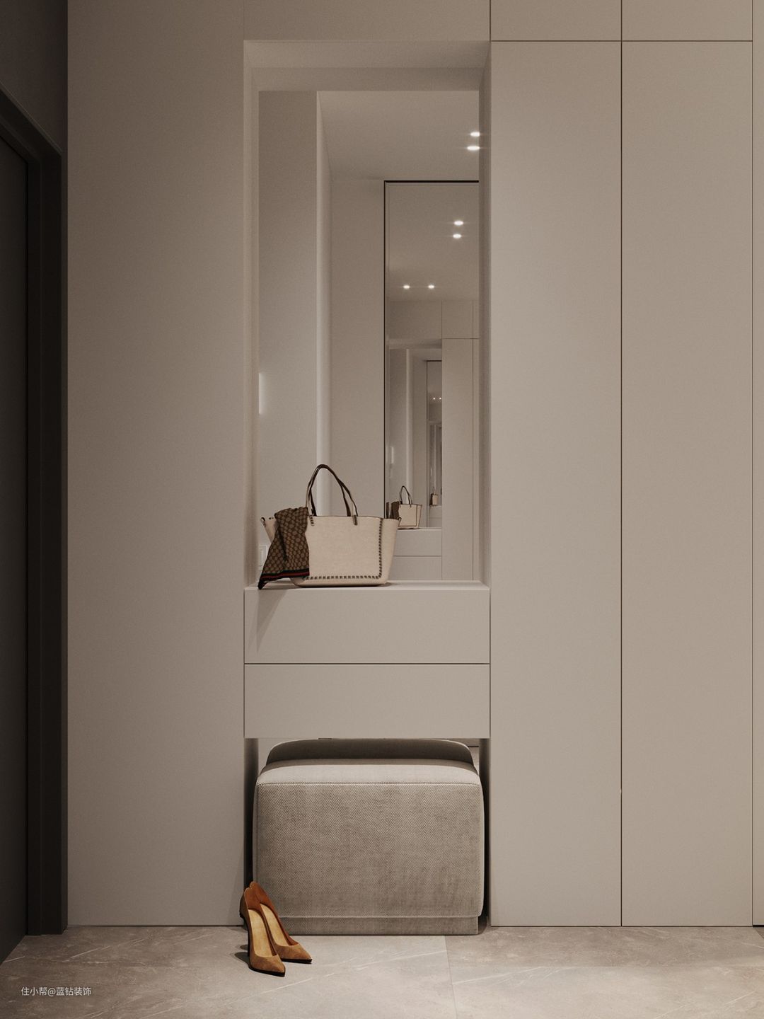 入户门的侧边是玄关,一个简单的白色一体平板柜体,设计了一个换鞋凳,一面镜子,可以出门整理一下仪容仪表,换鞋也很舒适,不用弯腰了,直接提供了便利。