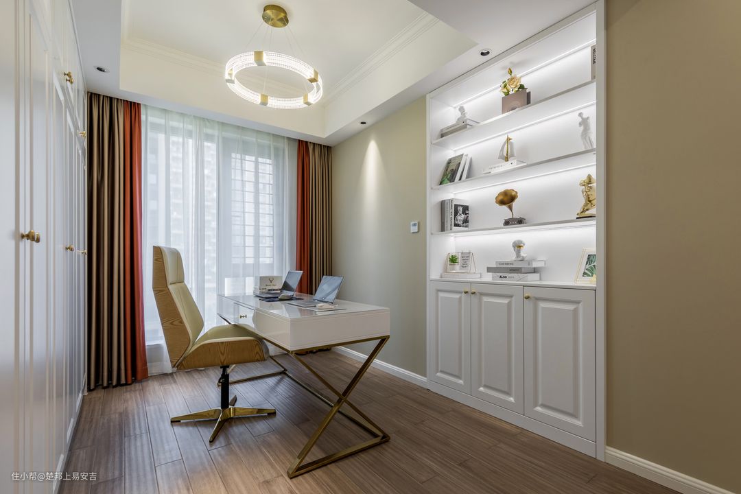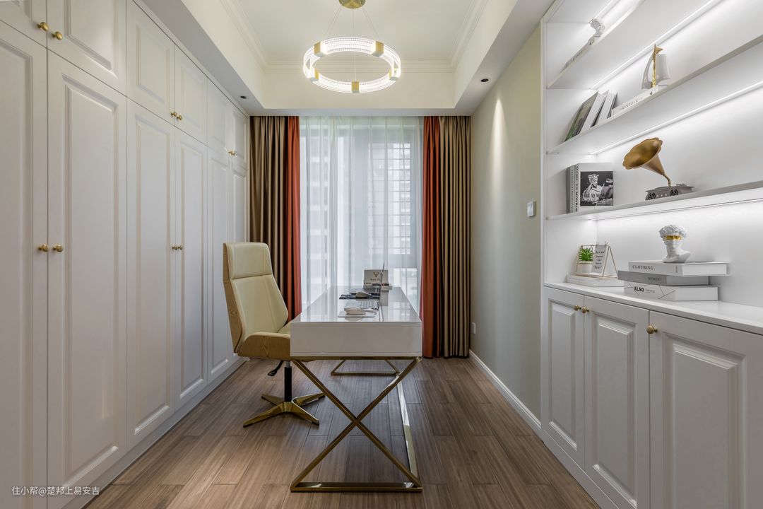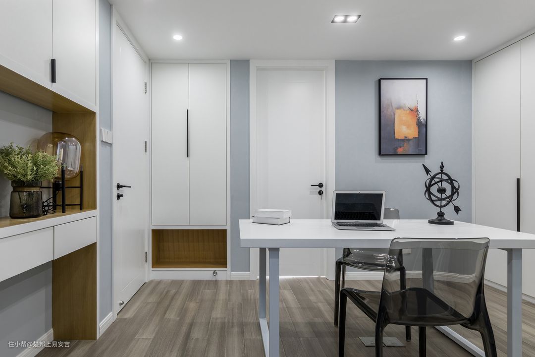 暖色调的搭配,白色的书柜上放些艺术品,使书房带有艺术气息,整面的落地窗提供白天读书所需的光源,棕色的地板搭配,简约舒适。书桌后面的储物柜也可以存放反季的衣服。给家里提供收纳空间。
