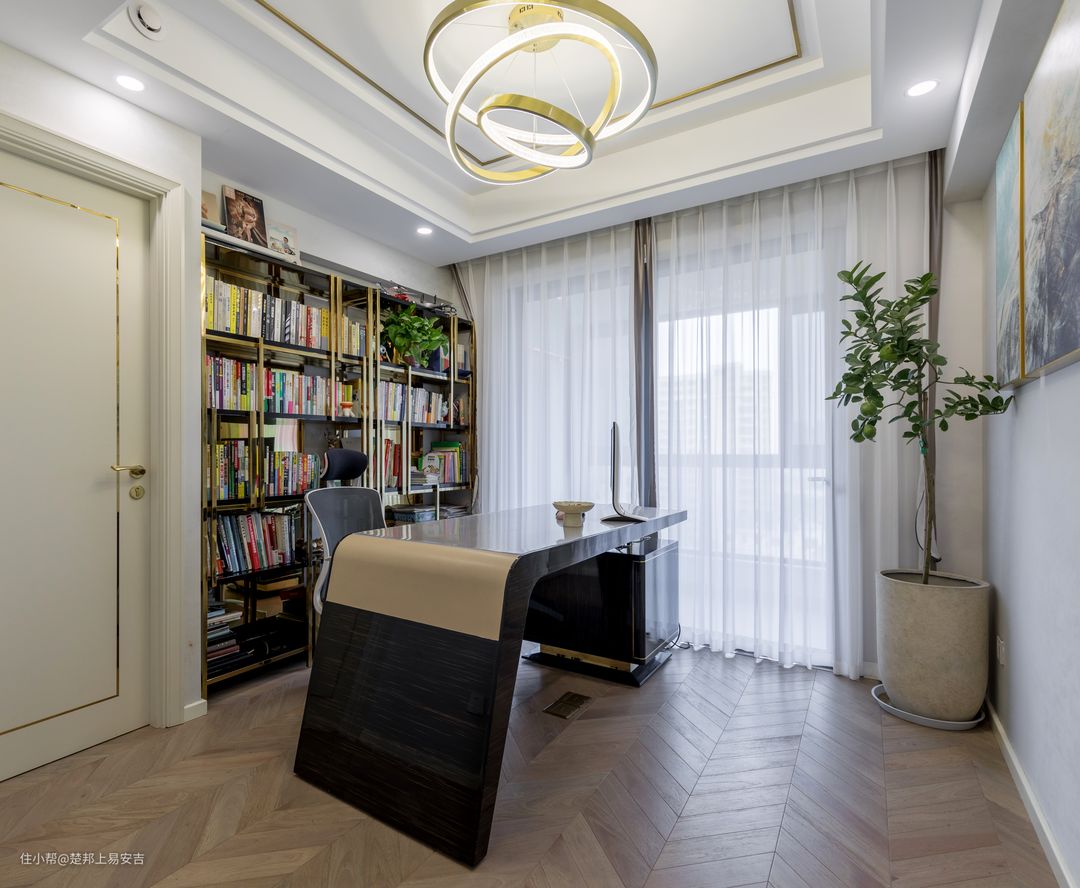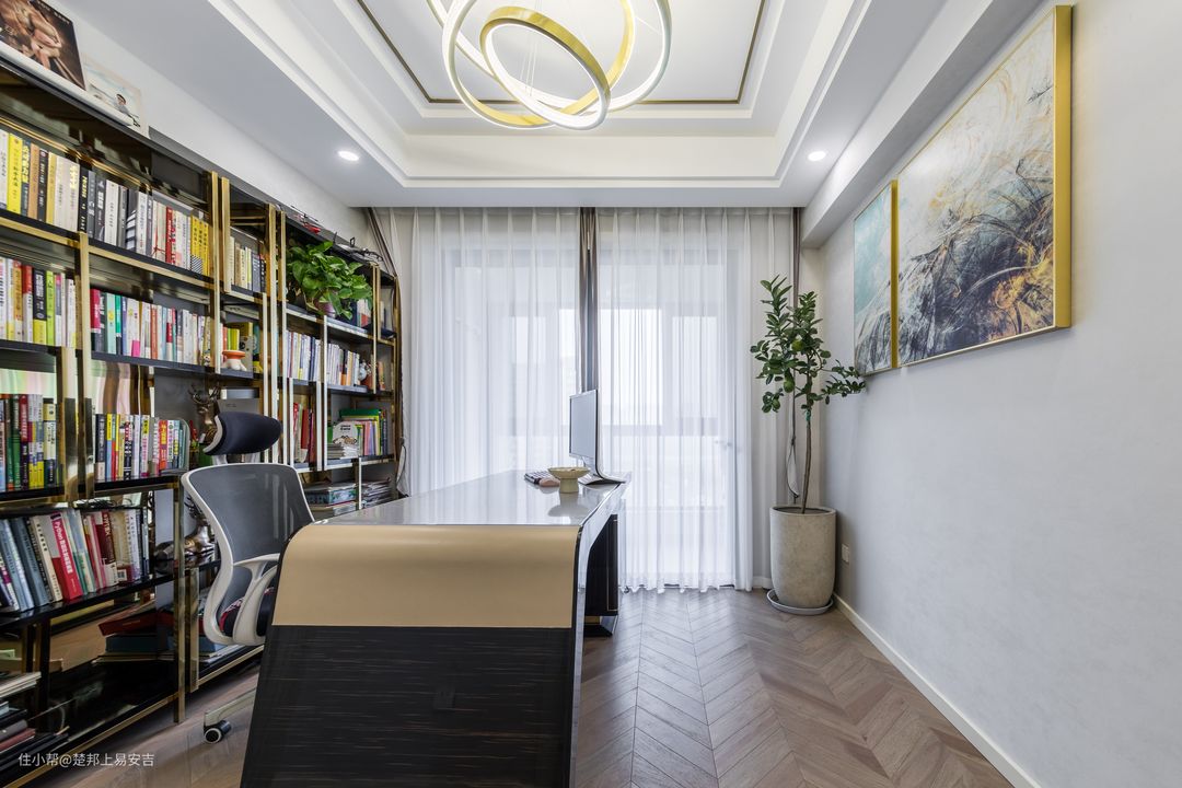 放满书籍的书架,提供书房所需的书生气,大量的书籍引人注目,让人不自觉的投入进去学习,地板以人鱼纹铺满地面,质感十足,绿色植被点缀房间,让人想象到一个年轻书生的感觉。