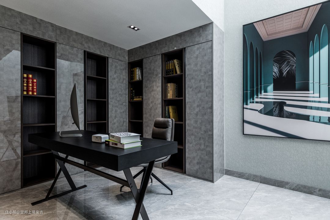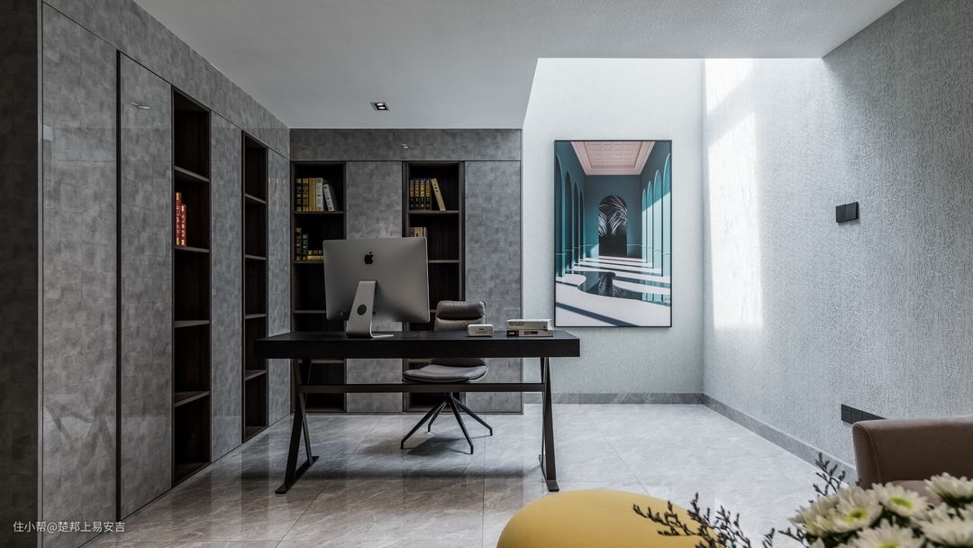 灰色的色调,是书房充满宁静的气息,书柜黑色的书桌沉稳的感觉扑面而来,在顶楼设计有天窗,阳光通过天窗使整个房间明亮,夜间的月光搭配着屋内无主灯的设计,宁静高雅。