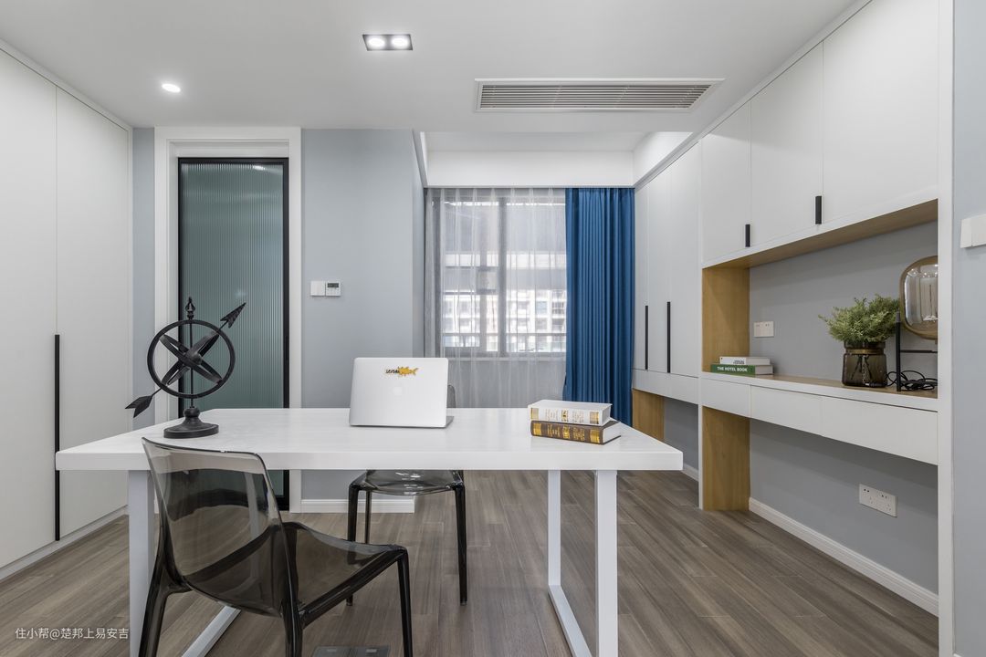 整体空间以白色调为主,白色的墙面与柜面,打造一个整洁、明亮的立面空间。原木的柜体搭配实木地板,简约的设计大气雅致,无论平常工作还是看书都可以满足所需。