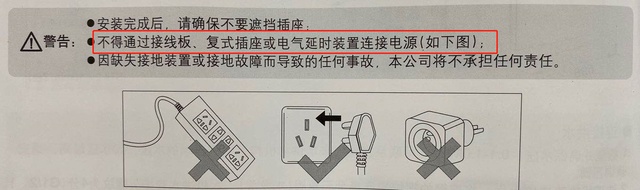 如果你认真读说明书的话,就会发现里面明确注明:“不得通过接线板、复式插座或电气延时装置连接电源”。