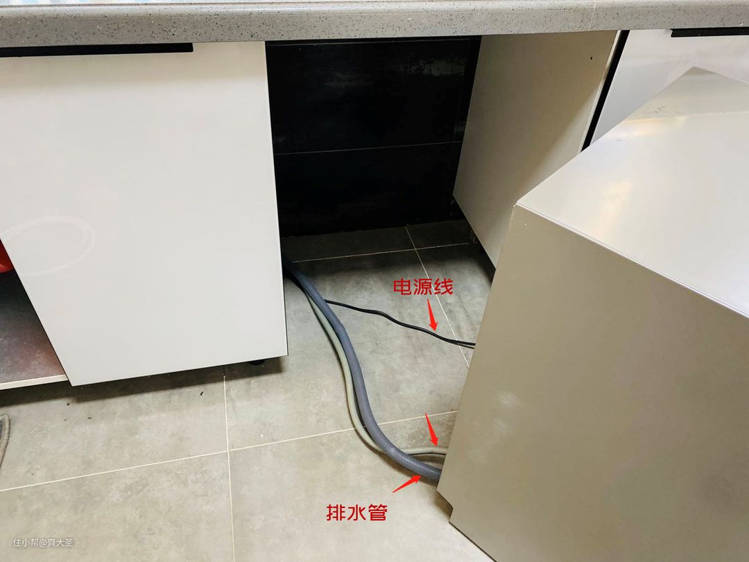从下图可以发现,洗碗机与外界连接的只有三根线路:一根进水管(冷水)、一根排水管、一根电源线。所以我们需要注意的就是要使用洗碗机,一定要在附近预留上下水及插座。