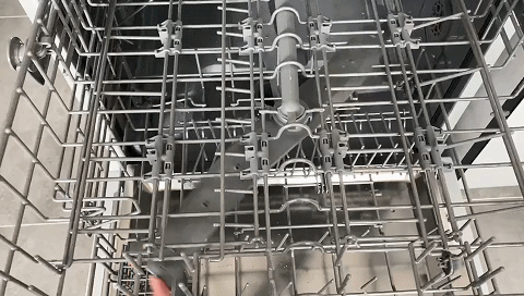 ②洗涤液通过管子进入喷淋臂,由于水被高速高压冲击到餐具上,从而将污渍冲刷掉,随后脏水被排走。