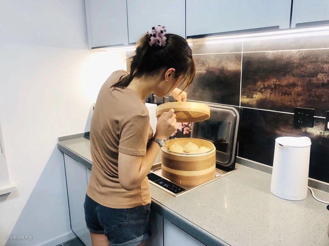 个人更喜欢纯白的钢化玻璃面板,在市面上也比较少见,相比黑色一摸一个手印更耐脏,和我家这种超白晶钢板的橱柜门板材质也特别的配。