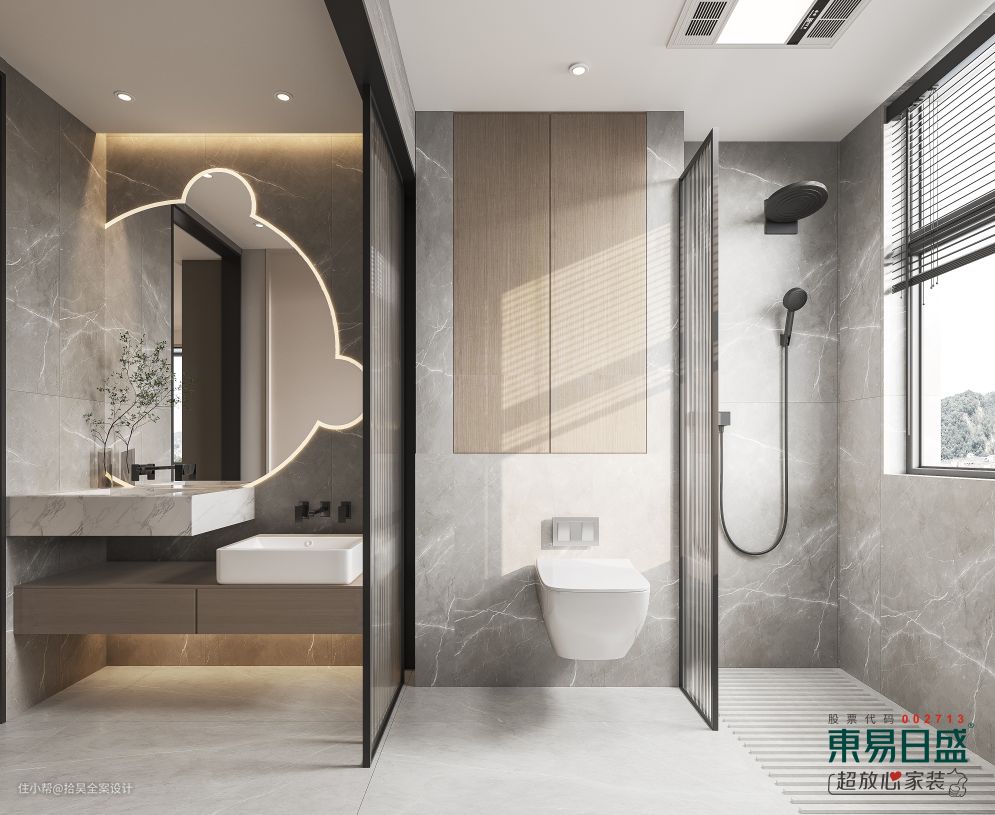 卫生间三分离的规划设计,互不干扰满足了一家的使用高低台面的设计,并满足了大人的使用,也考虑到了小孩的使用,壁挂的马桶使用美观,清理方便,墙面的储物柜让卫生间拥有合理的收纳。