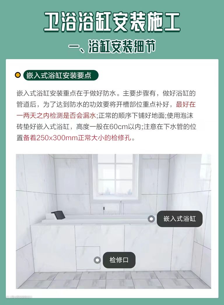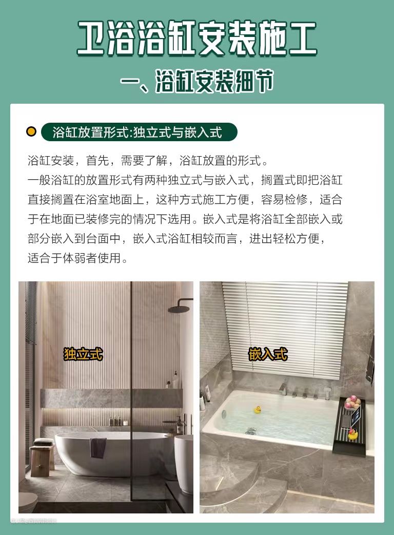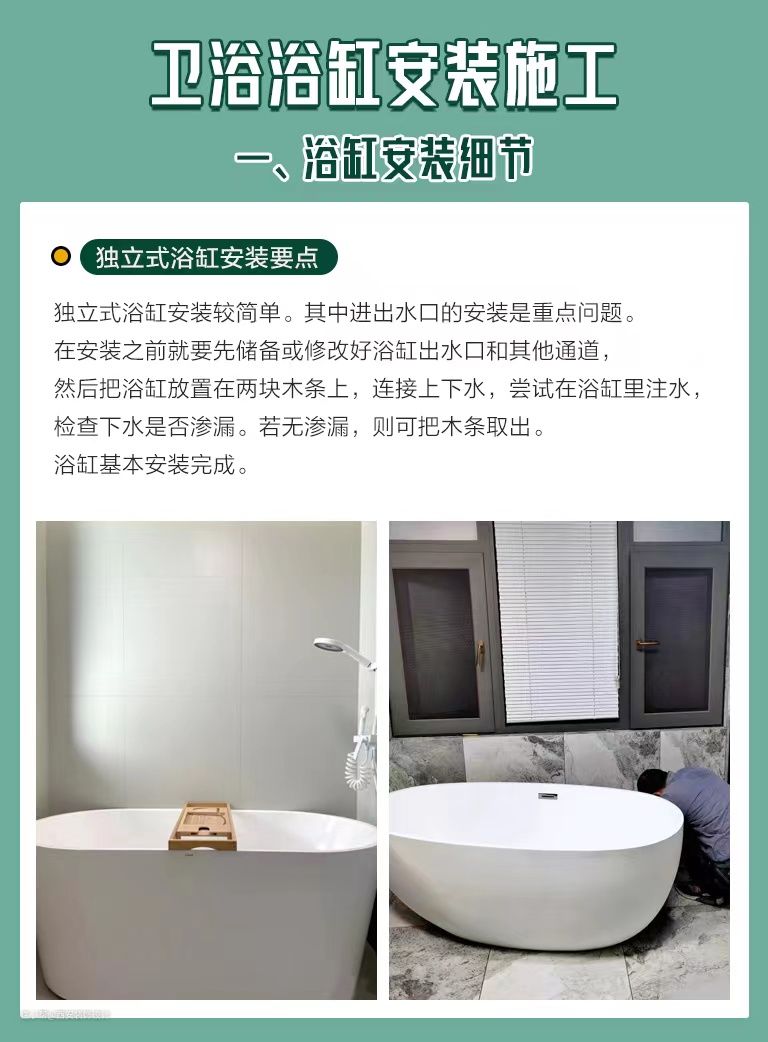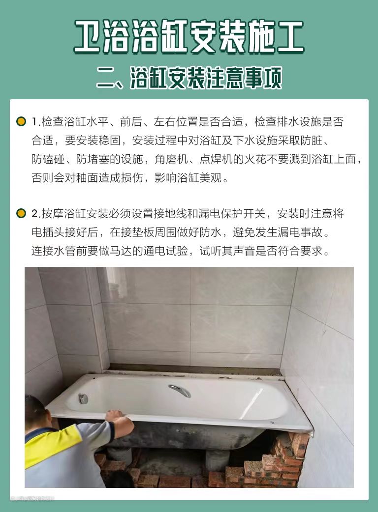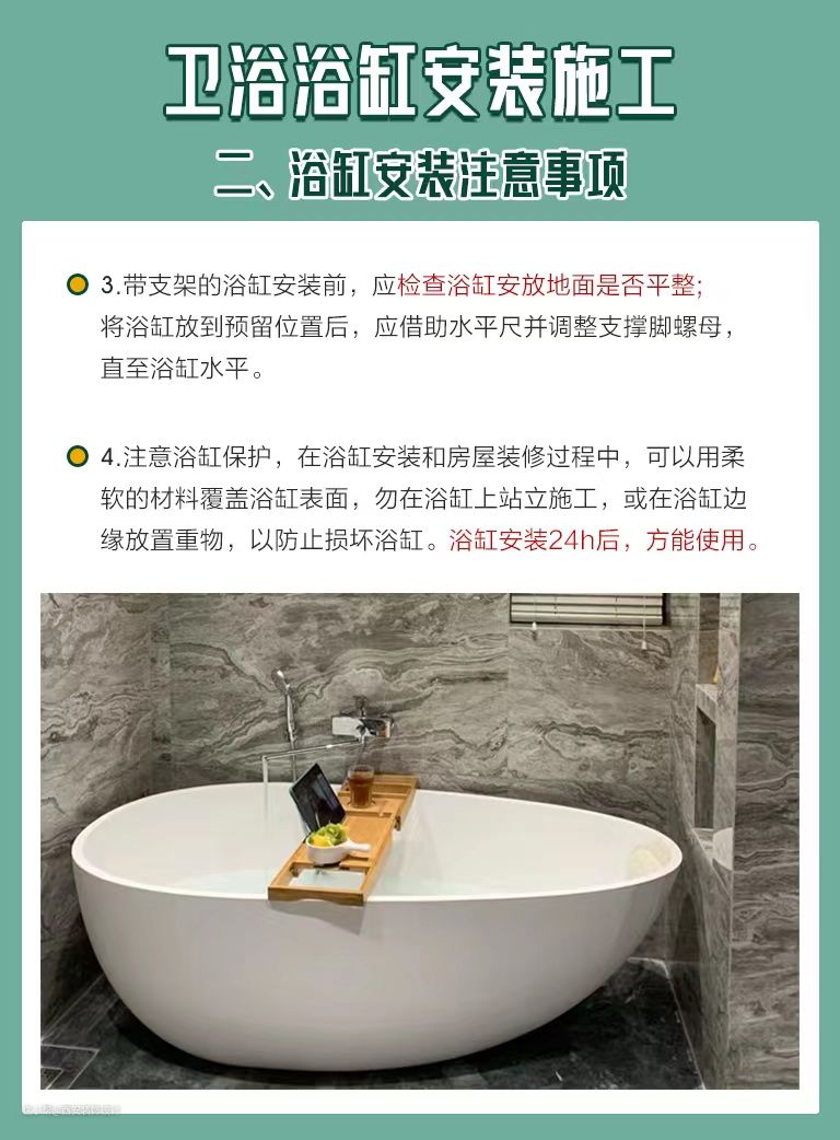 卫浴浴缸安装避坑指南, 安装注意事项看这里!西安装饰设计2022-09-11时代的发展在进步,人们的生活水平也在提高,很多的家庭都喜欢在家中的浴室安装浴缸,这样可以让自己洗澡的时候更加的舒服。但是呢,浴缸的安装不是一个简单的事情,因为一旦出现安装错位等一些问题,都将会影响到浴室的正常使用问题。下面给大家整理了一些浴缸安装时需要注意的细节。