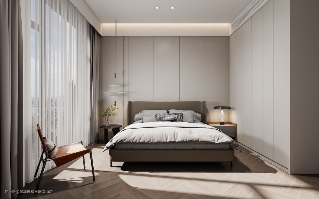 次卧同样是浅灰色为背景墙,嵌入式的一整面到顶衣柜,菱形木地板铺设,增加空间感